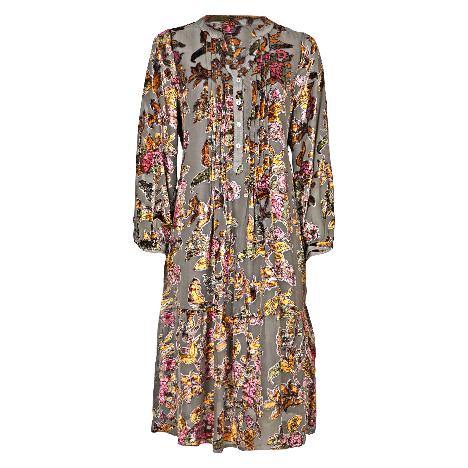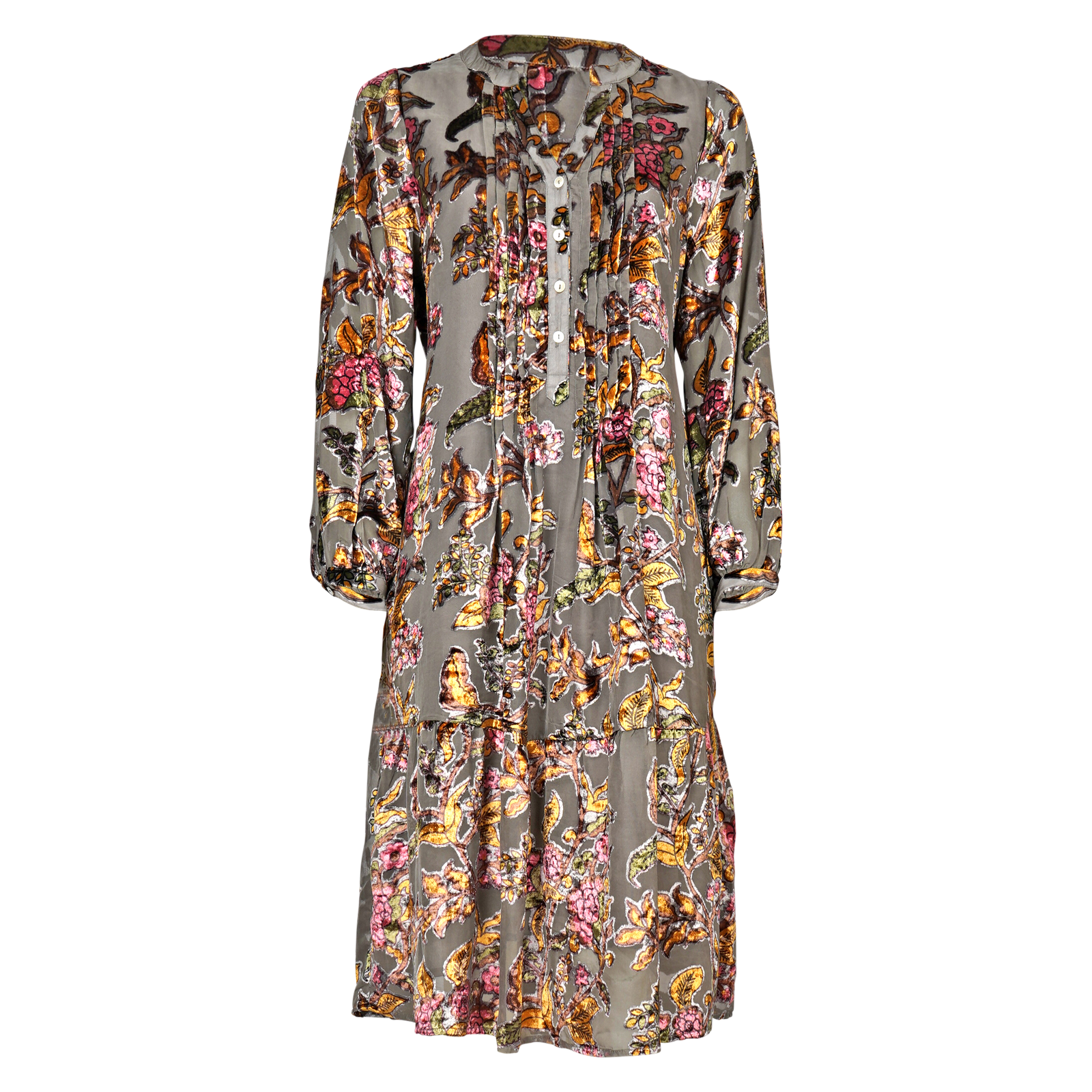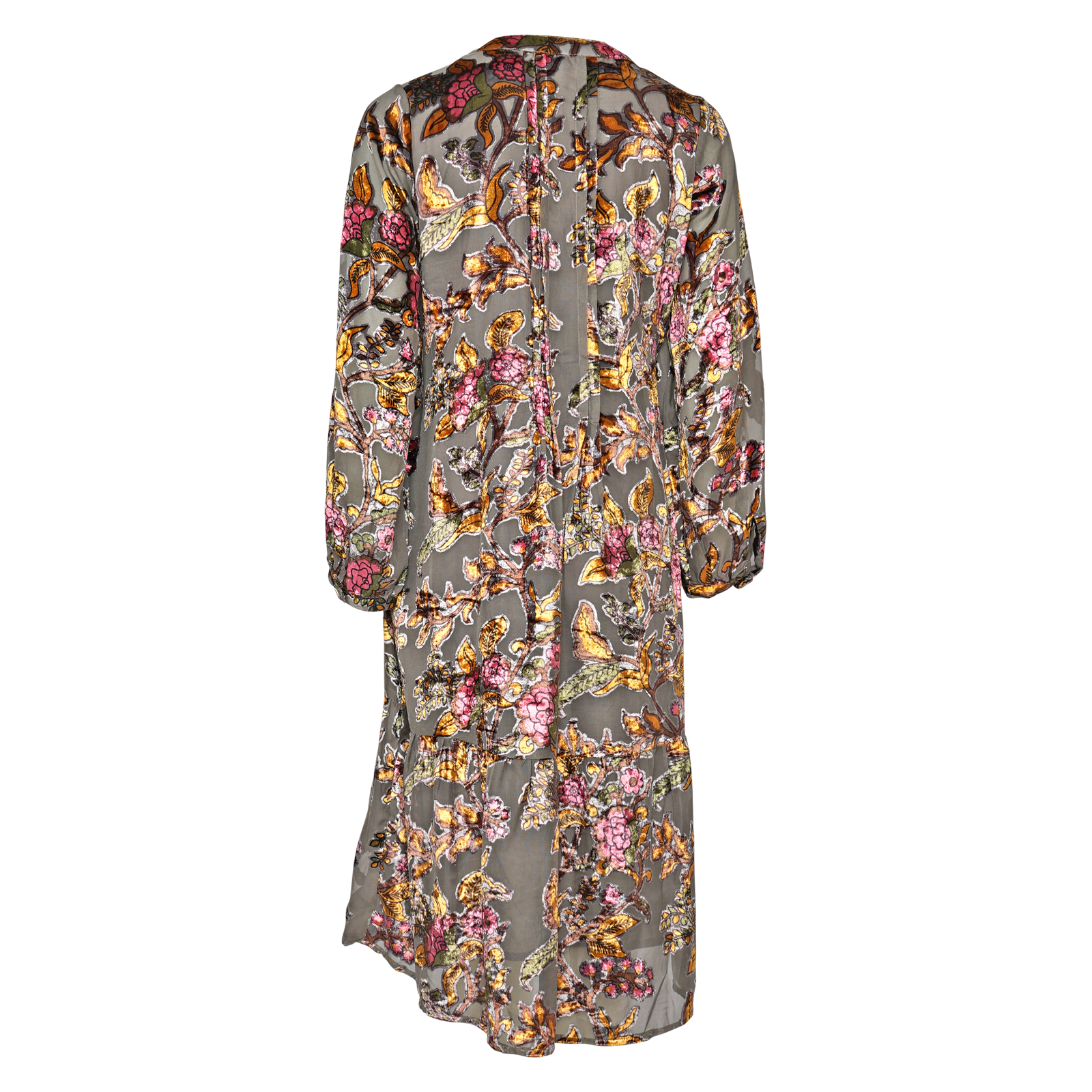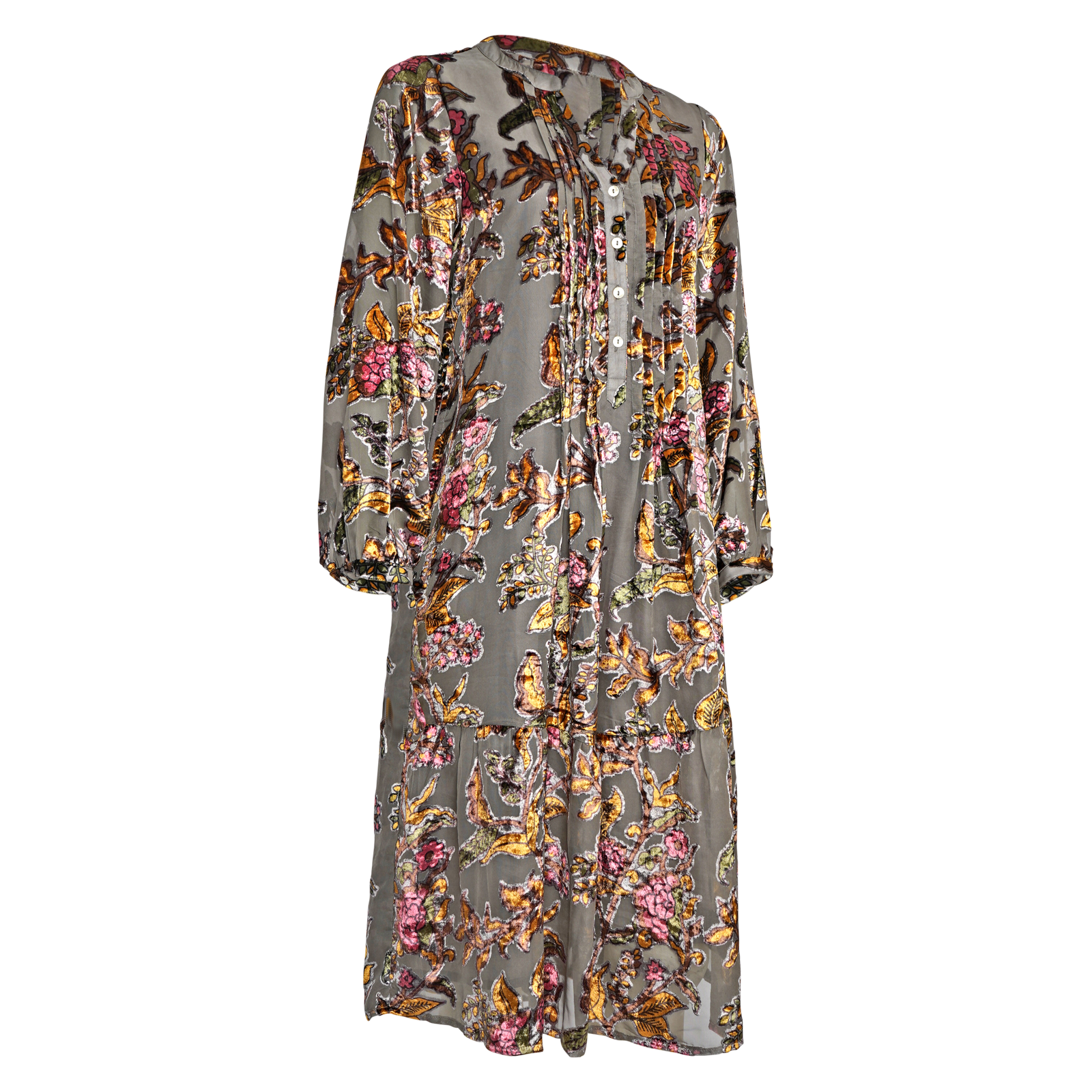 (der Samt wird um die Blumen herum"ausgebrannt", sodass nur noch die Blumen samt Druck als Samt auf dem Stoff bleiben)