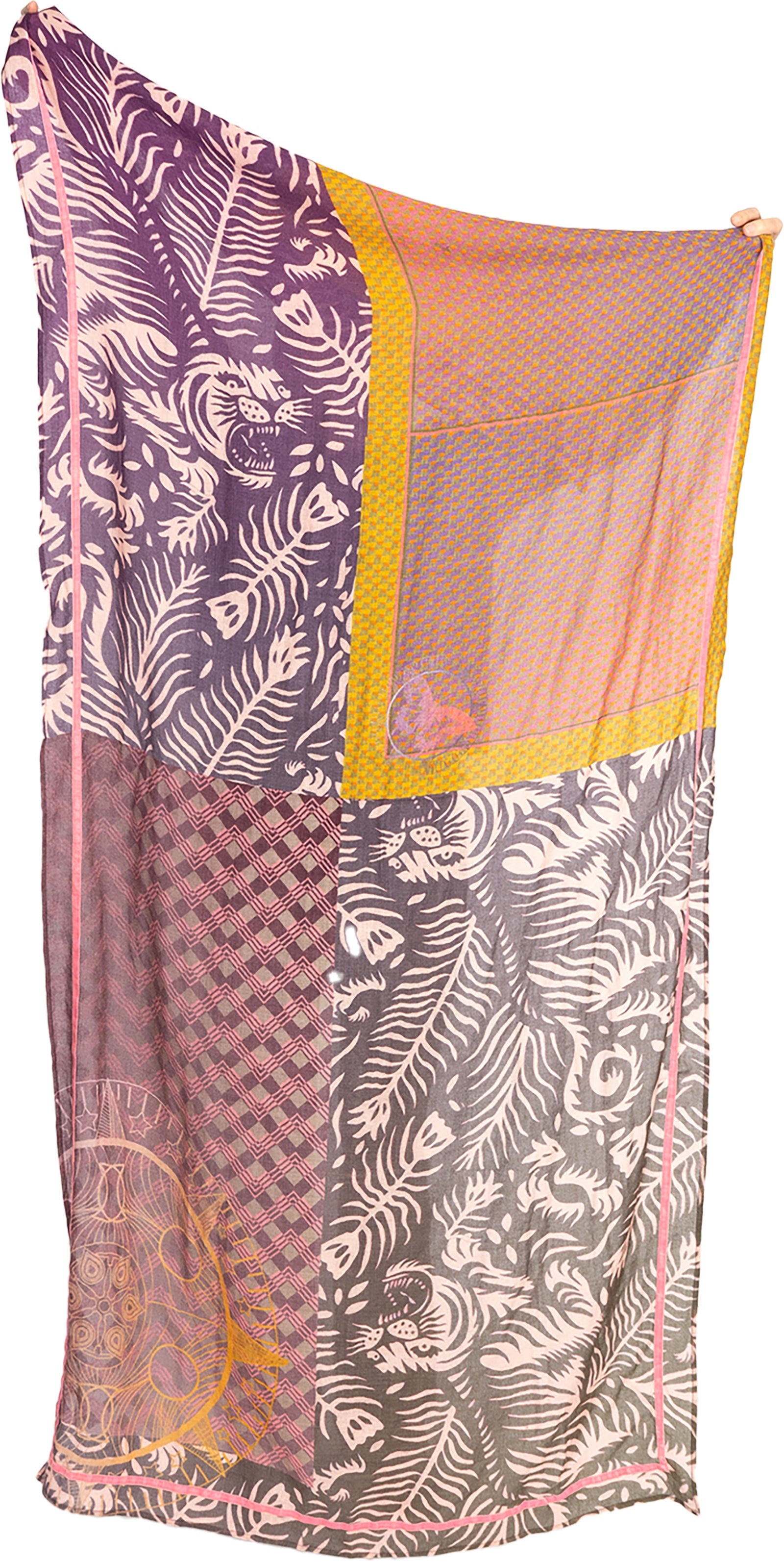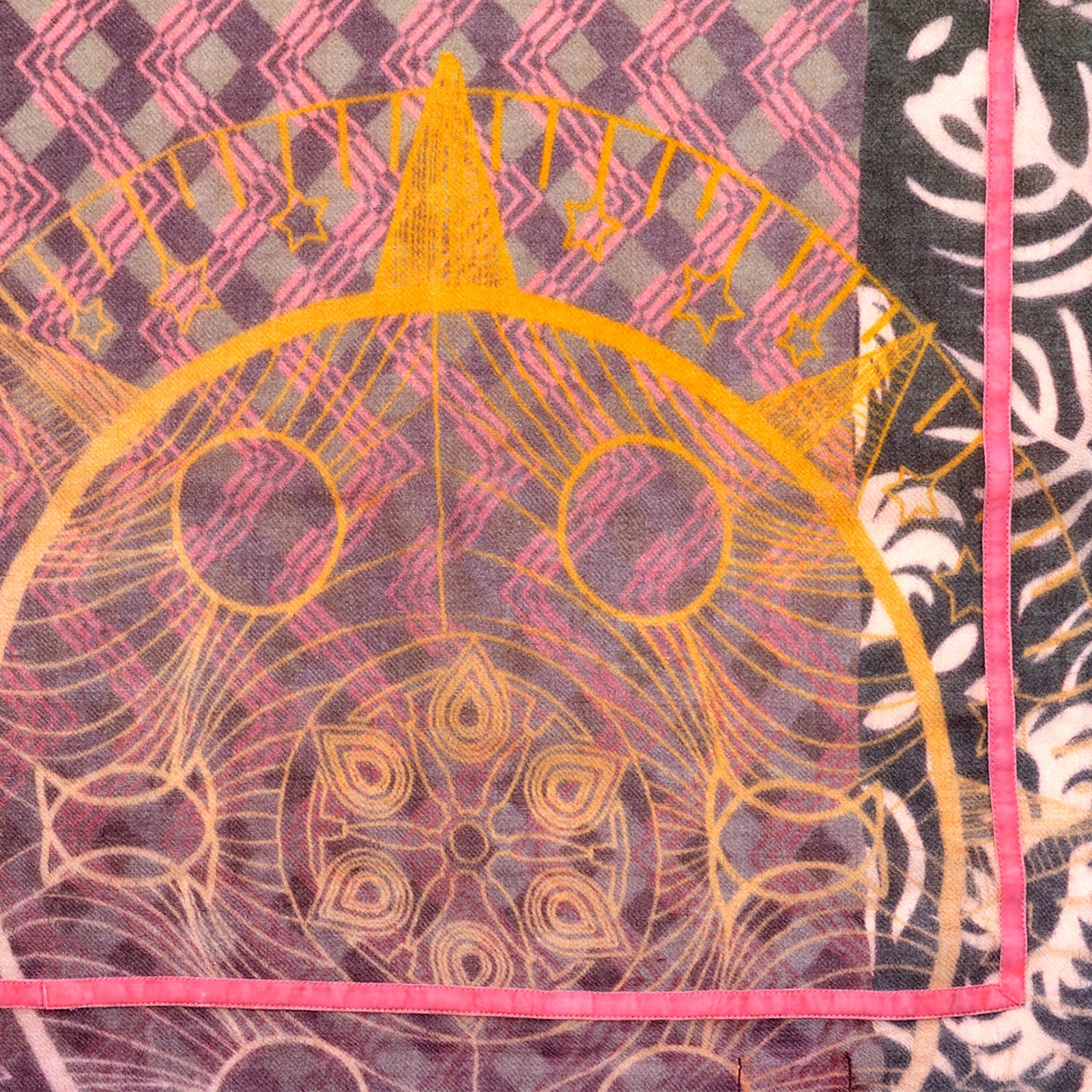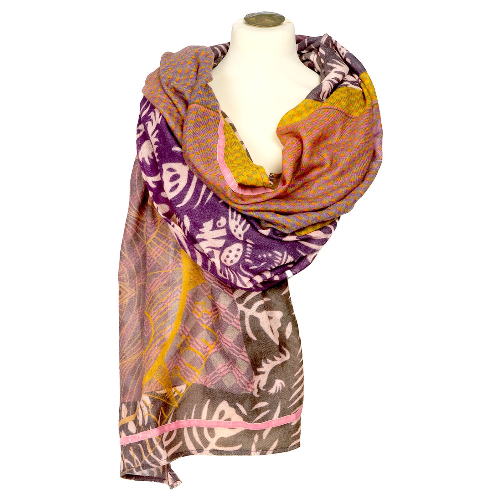 Original-Rubicon Tuch mit wünscherschönem Druck in Violett und grau Tönen, die Wolle ist leicht gewaschen, ein leichter Filzcharakter ist gewollt und gibt dem Schal einen kuscheligen weichen Handgriff.