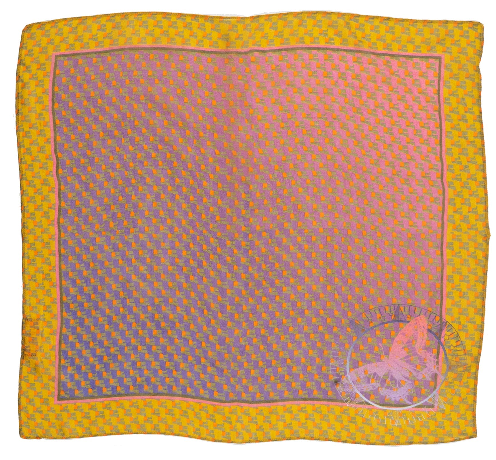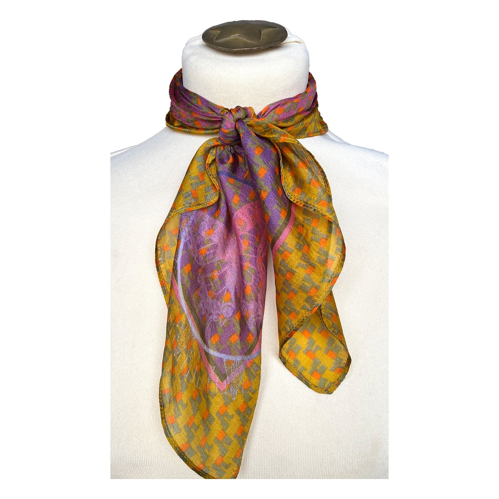 Original-Rubicon Tuch mit Druck aus leichter fliessender Seide in gelb und violett Tönen, die Seide schmiegt sich an den Hals, glatt und weich.