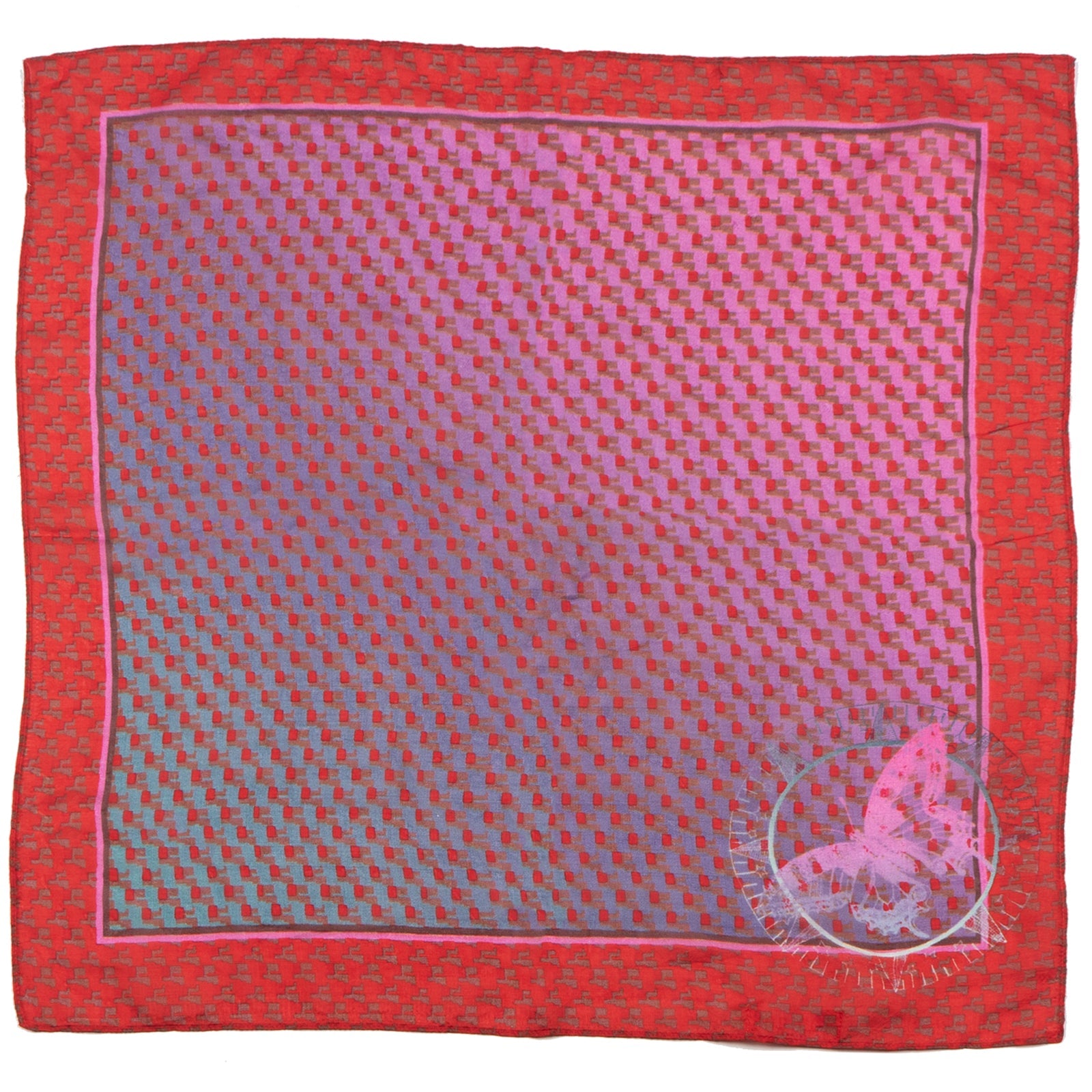 Original-Rubicon Tuch mit Druck aus leichter fliessender Seide in rot und bleu Tönen, die Seide schmiegt sich an den Hals, glatt und weich.