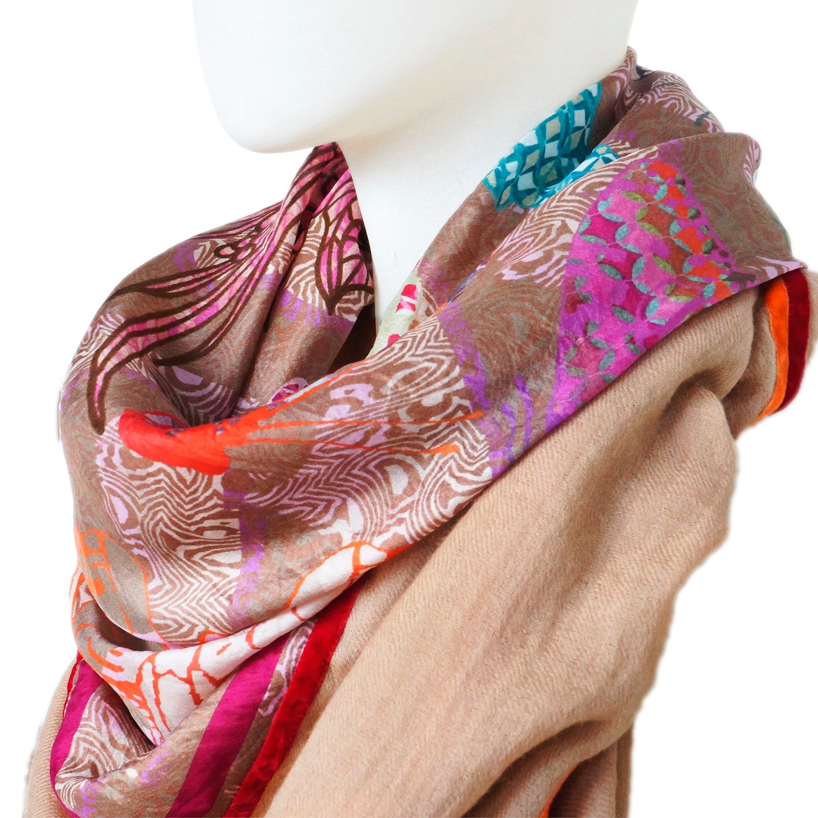 Original-Rubicon Tuch mit wunderschönem Seidendruck , die Wolle ist leicht gewaschen, ein leichter Filzcharakter ist gewollt und gibt dem Schal einen kuscheligen Handgriff, die Seide schmiegt sich an den Hals, glatt und weich. Schöne Akzente geben die bunten samtbänder am Rand.