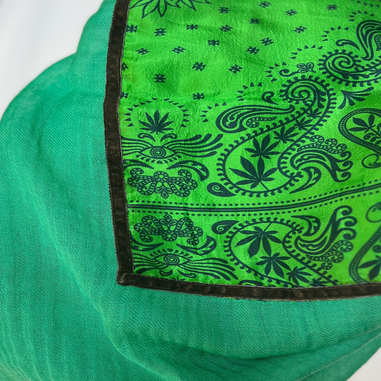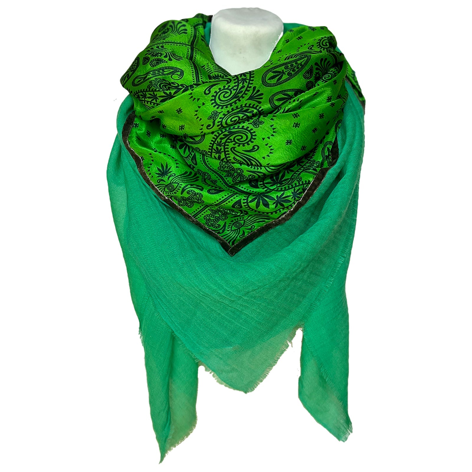 Original-Rubicon Tuch mit wunderschönem Seidendruck in Grüntönen, die Wolle ist leicht gewaschen, ein leichter Filzcharakter ist gewollt und gibt dem Schal einen kuscheligen Handgriff, die Seide schmiegt sich an den Hals, glatt und weich.