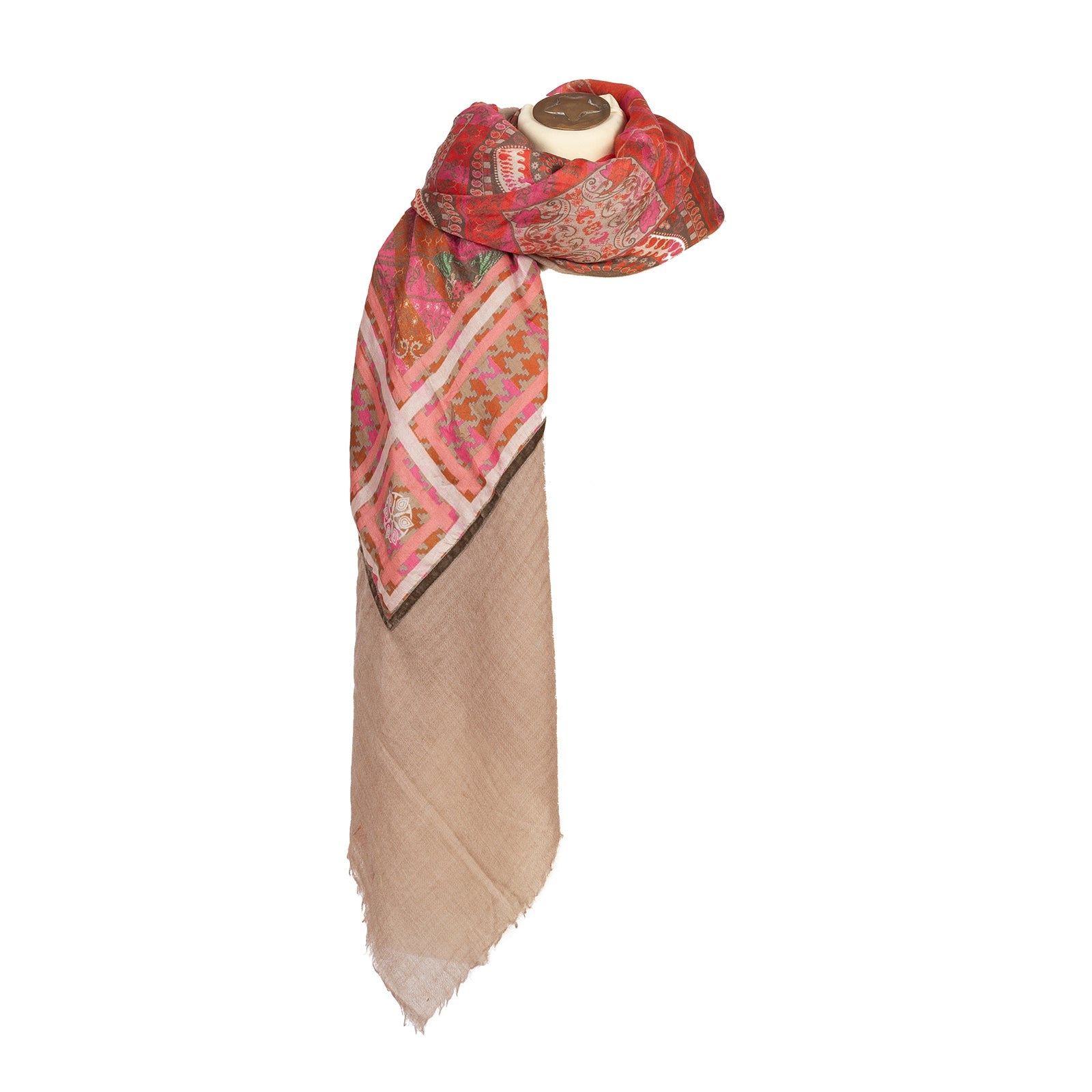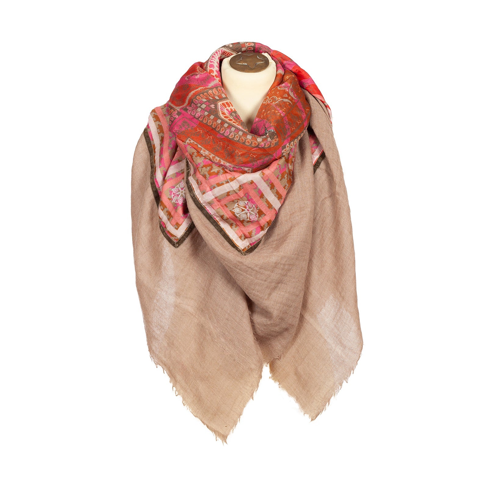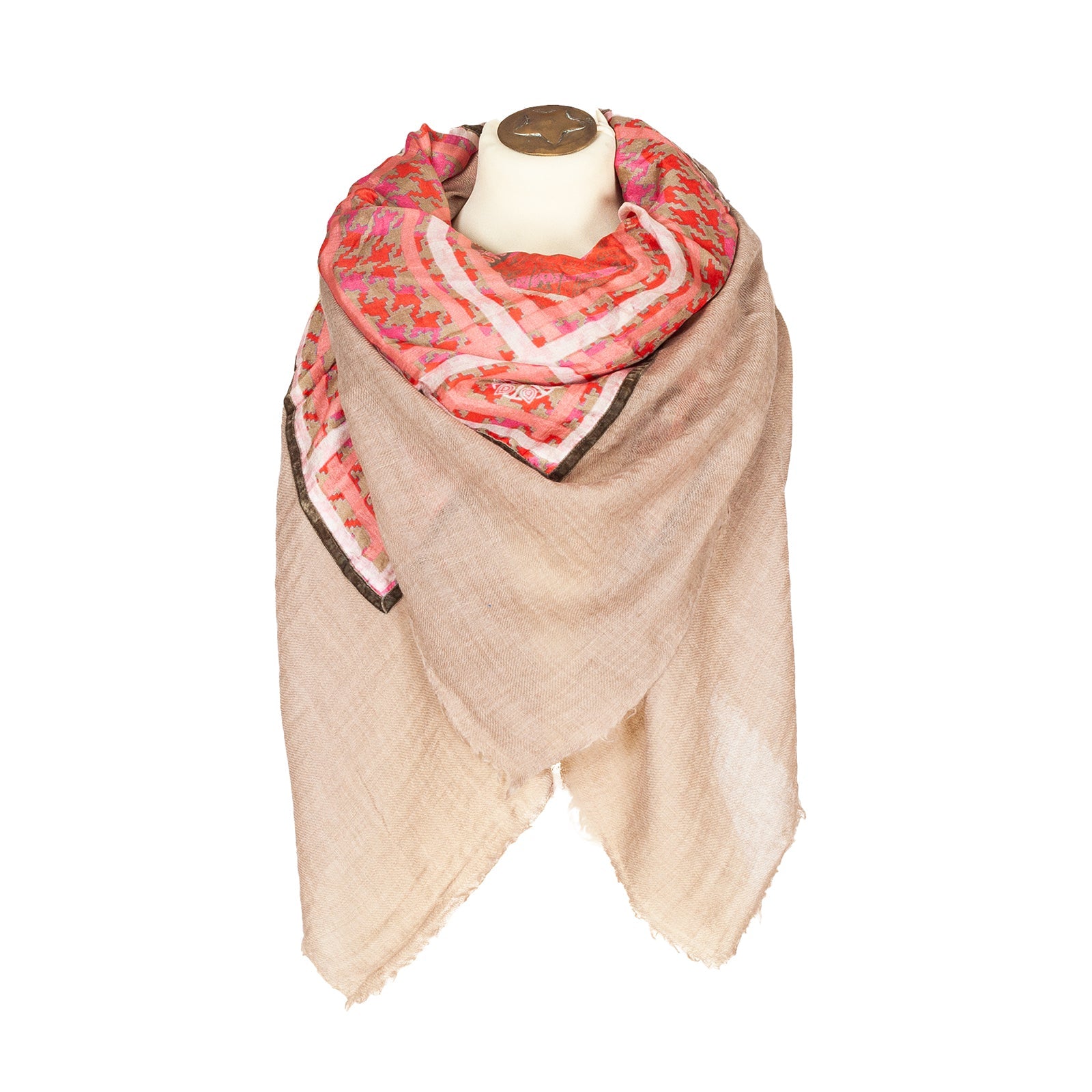 Original-Rubicon Tuch mit wunderschönem Seidendruck in sand, papaya und pink Tönen, die Wolle ist leicht gewaschen, ein leichter Filzcharakter ist gewollt und gibt dem Schal einen kuscheligen Handgriff, die Seide schmiegt sich an den Hals, glatt und weich .
