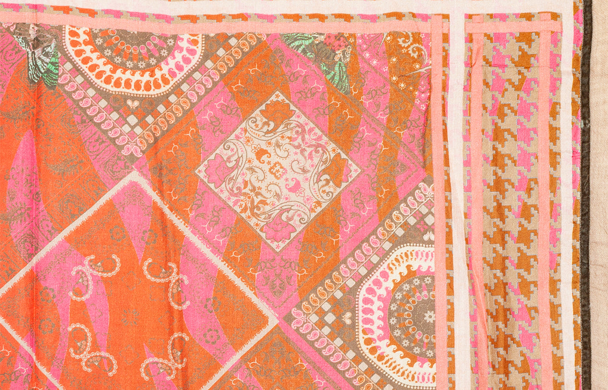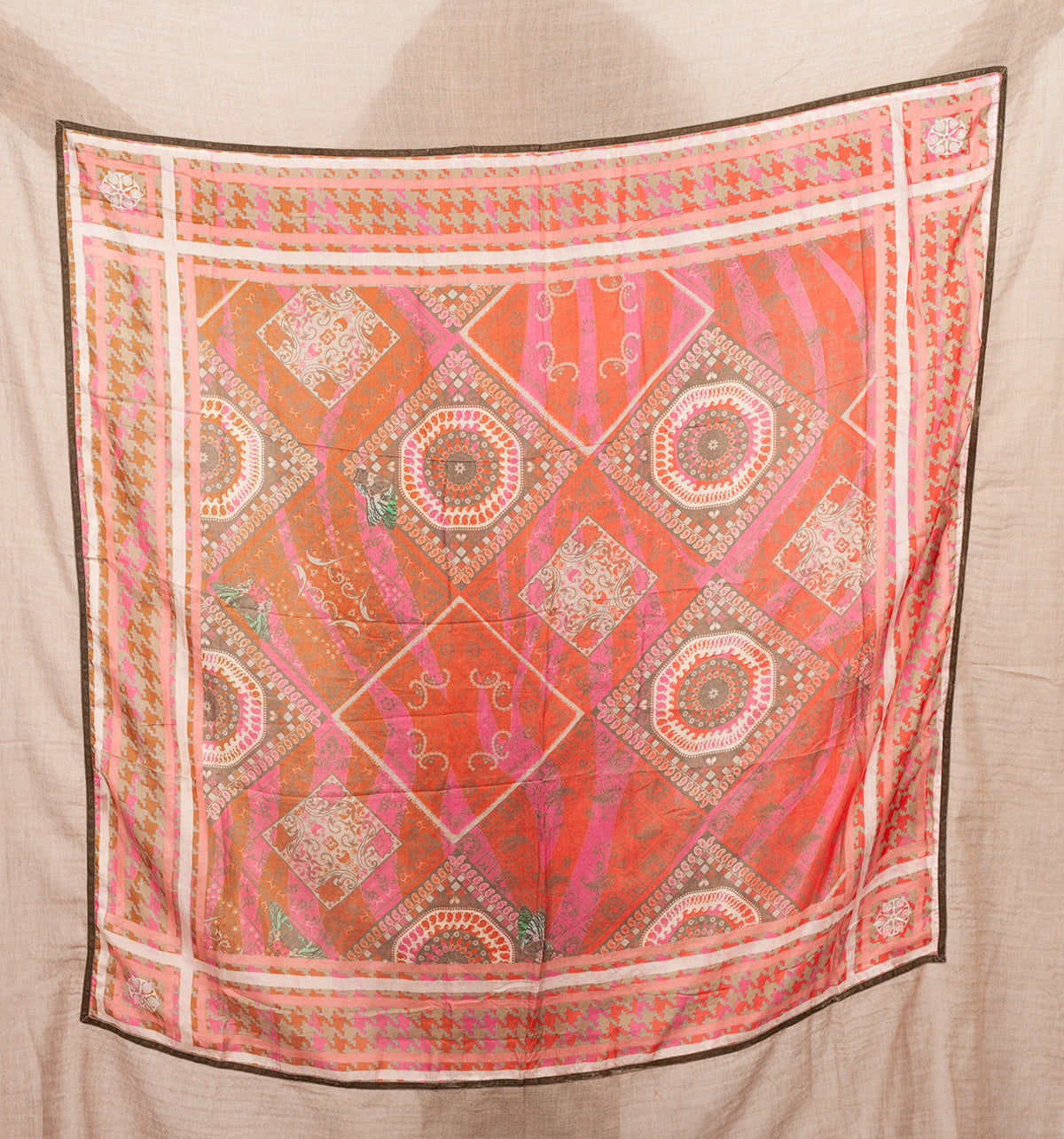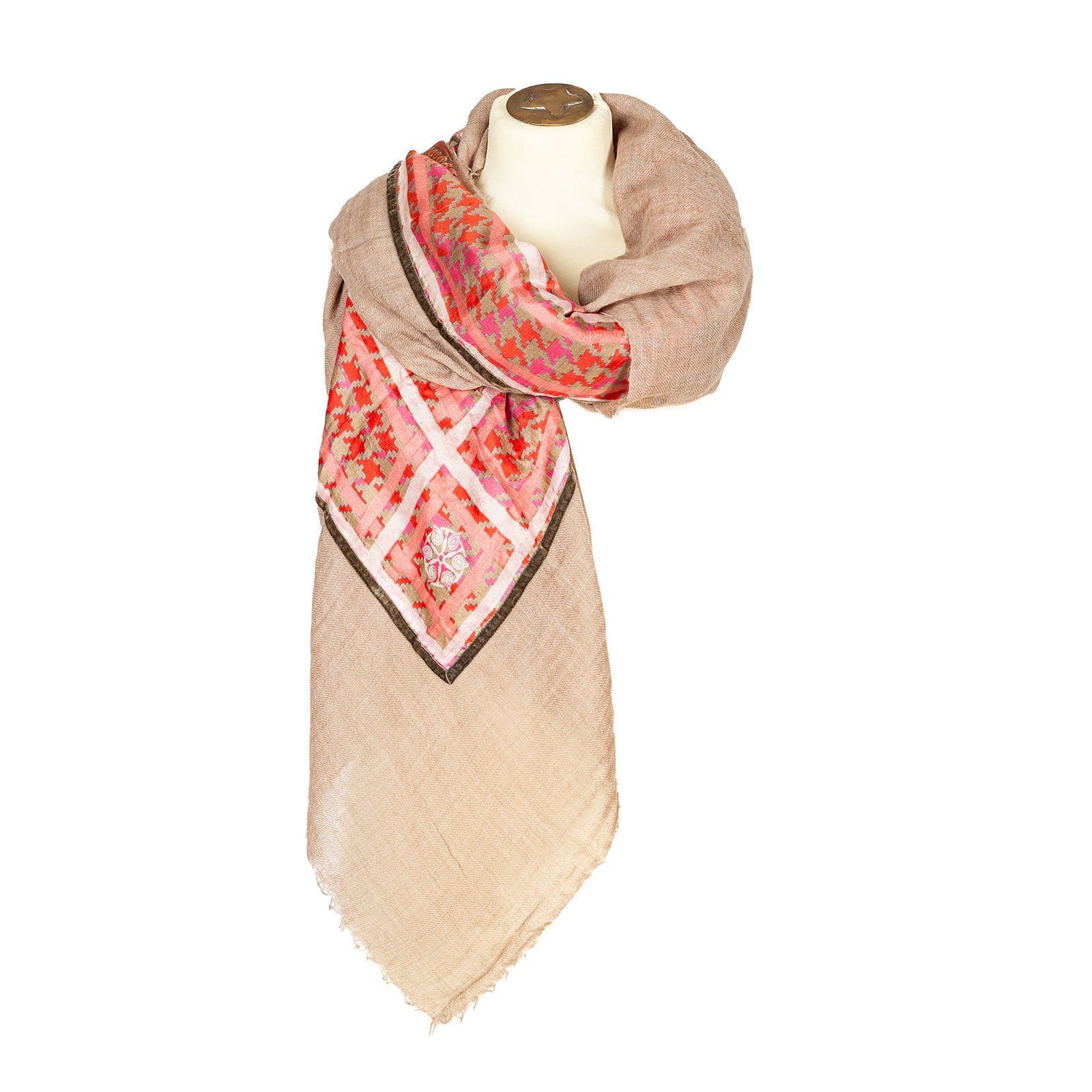 Original-Rubicon Tuch mit wunderschönem Seidendruck in sand, papaya und pink Tönen, die Wolle ist leicht gewaschen, ein leichter Filzcharakter ist gewollt und gibt dem Schal einen kuscheligen Handgriff, die Seide schmiegt sich an den Hals, glatt und weich .