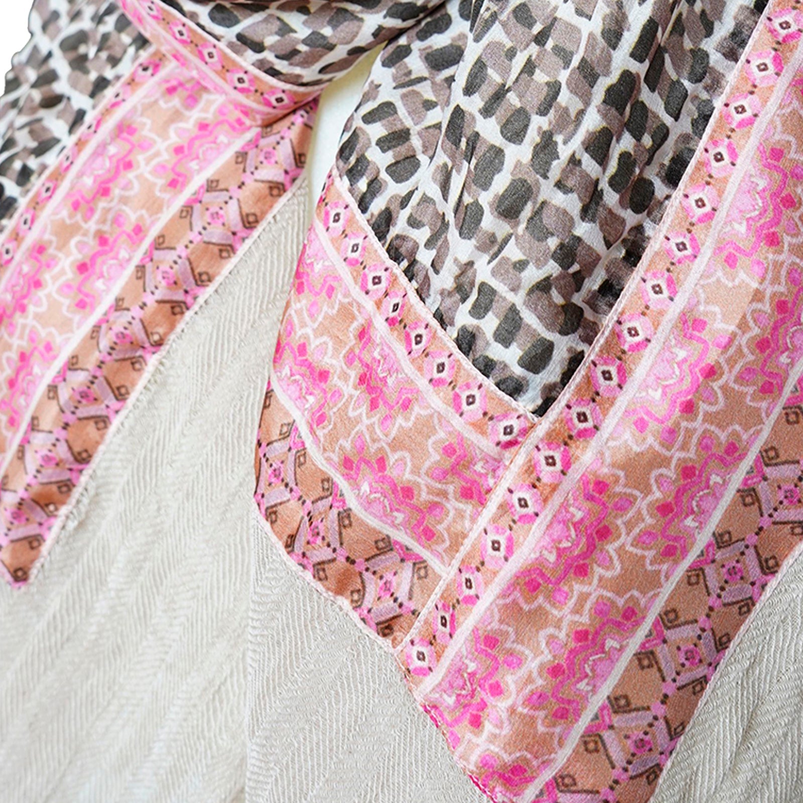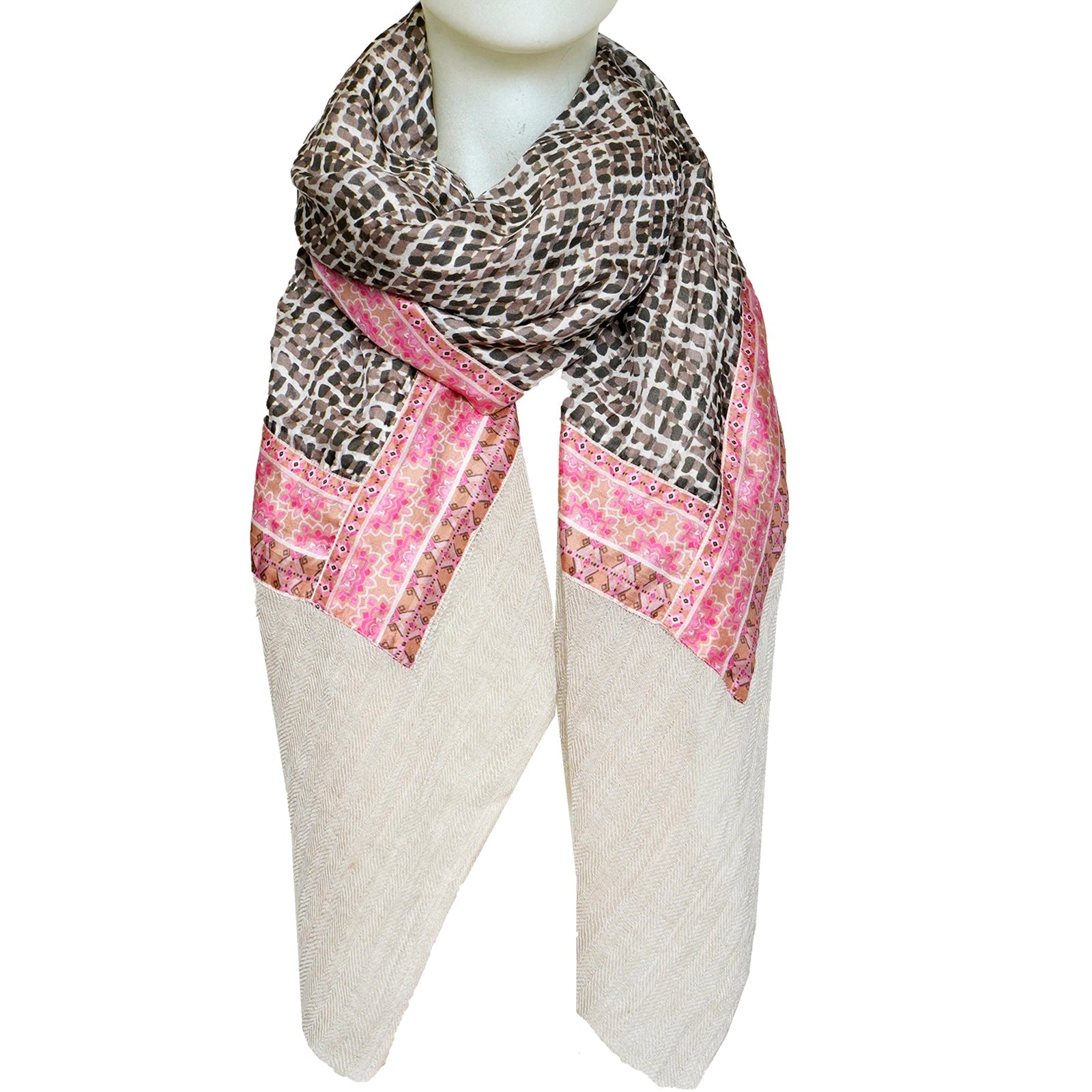 Original-Rubicon Schal mit gepatchten Seidendruck in Naturtönen auf einer Baumwool/Woll basis .
