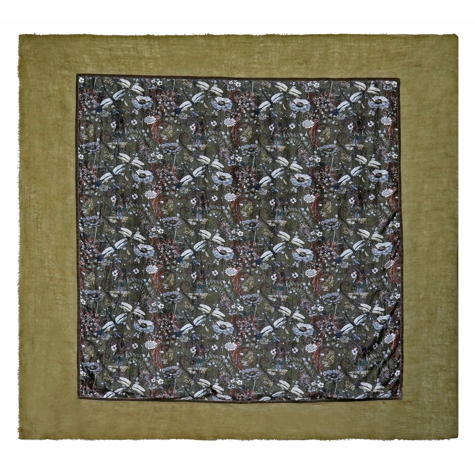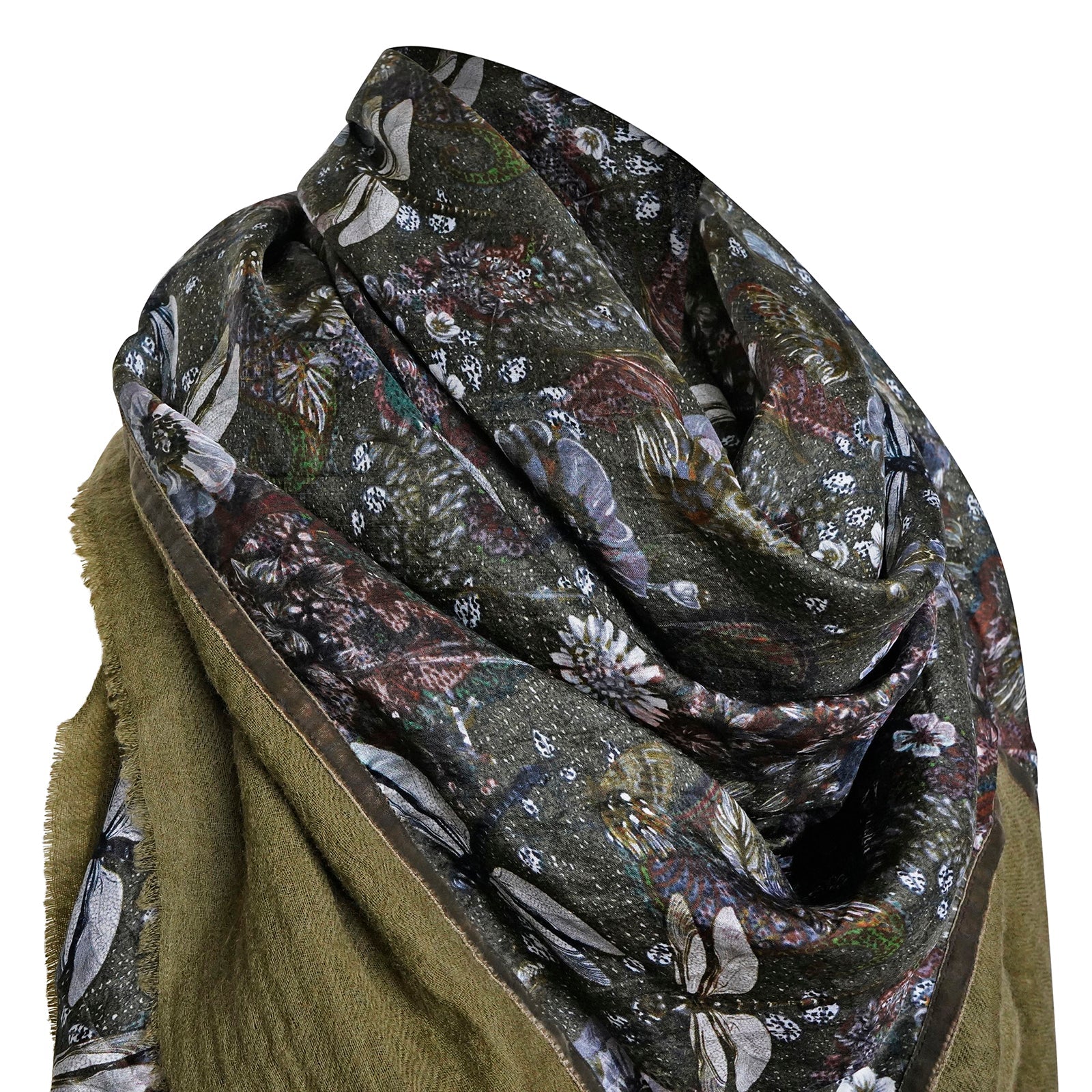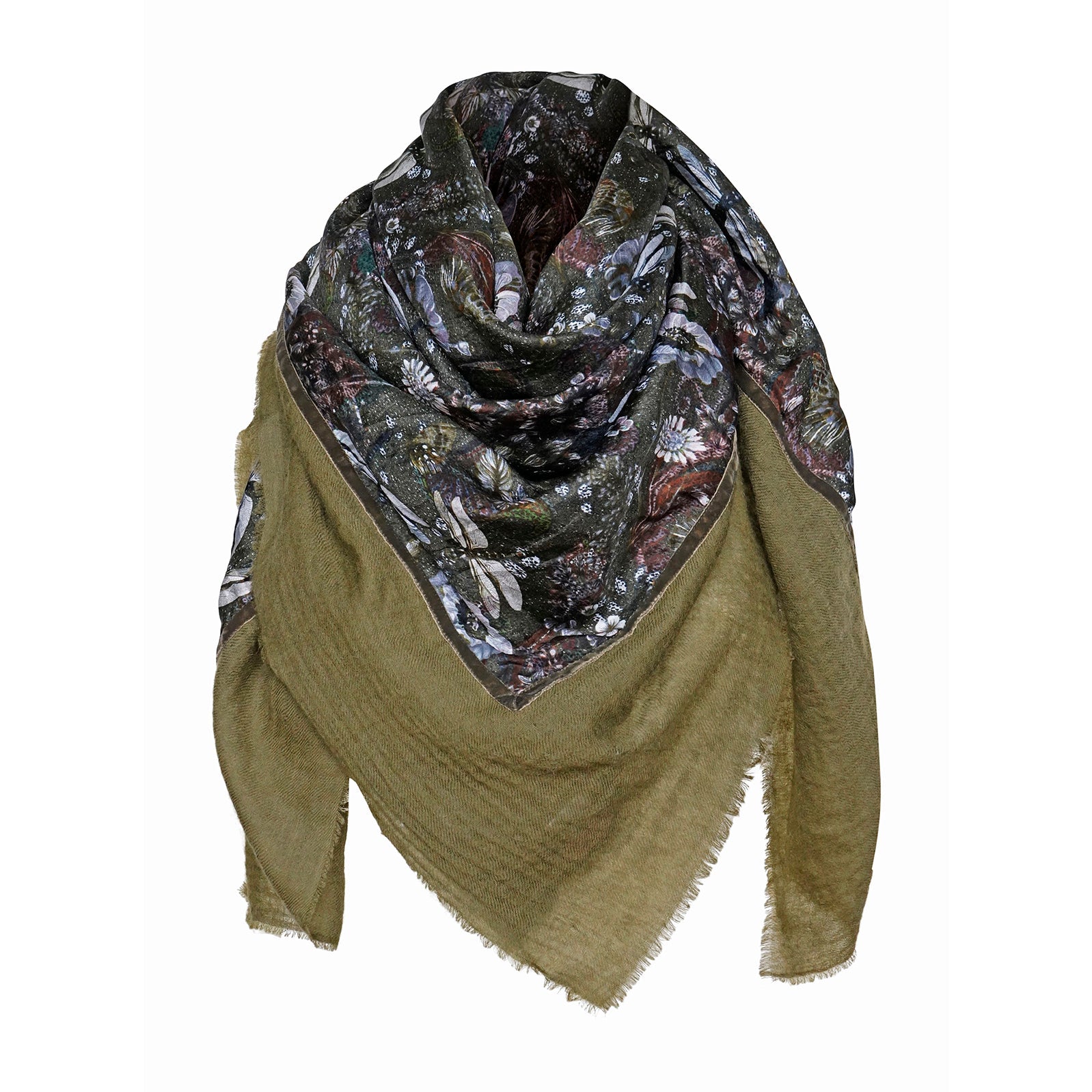 Original-Rubicon Tuch mit wunderschönem Seidendruck in kakitönen, die Wolle ist leicht gewaschen, ein leichter Filzcharakter ist gewollt und gibt dem Schal einen kuscheligen Handgriff, die Seide schmiegt sich an den Hals, glatt und weich.
