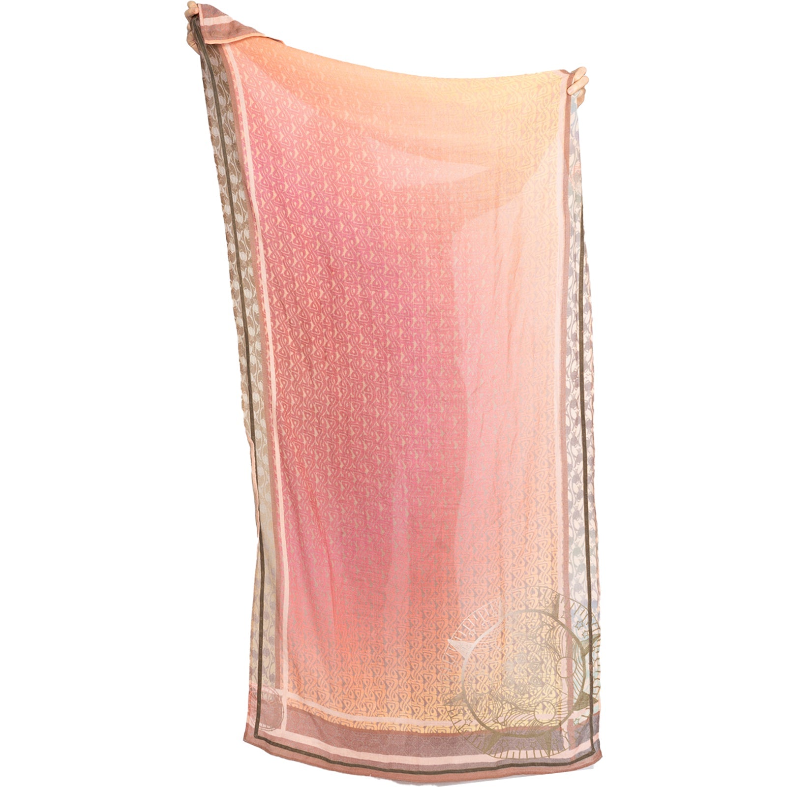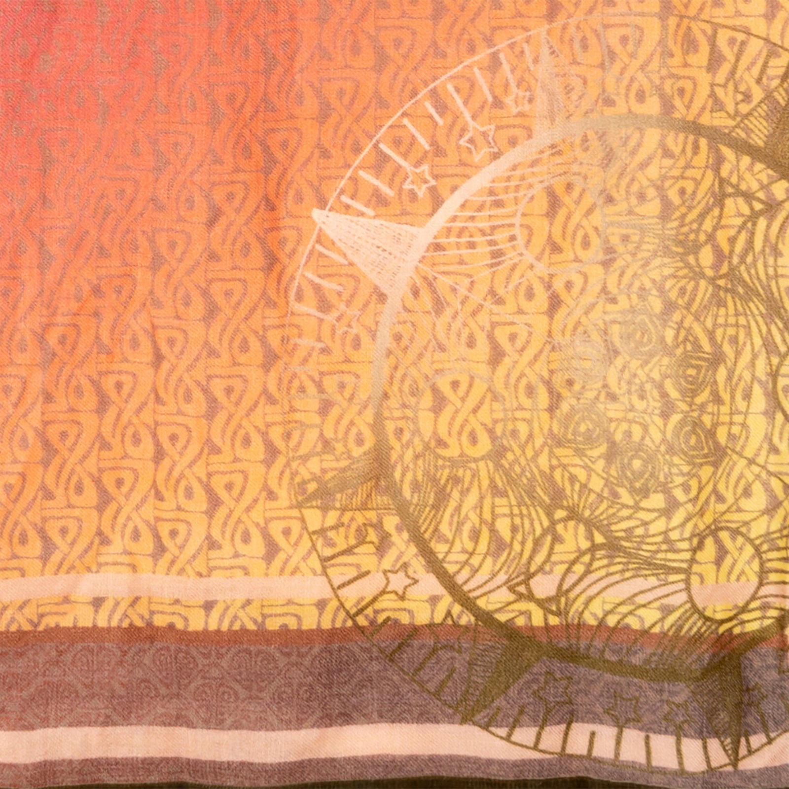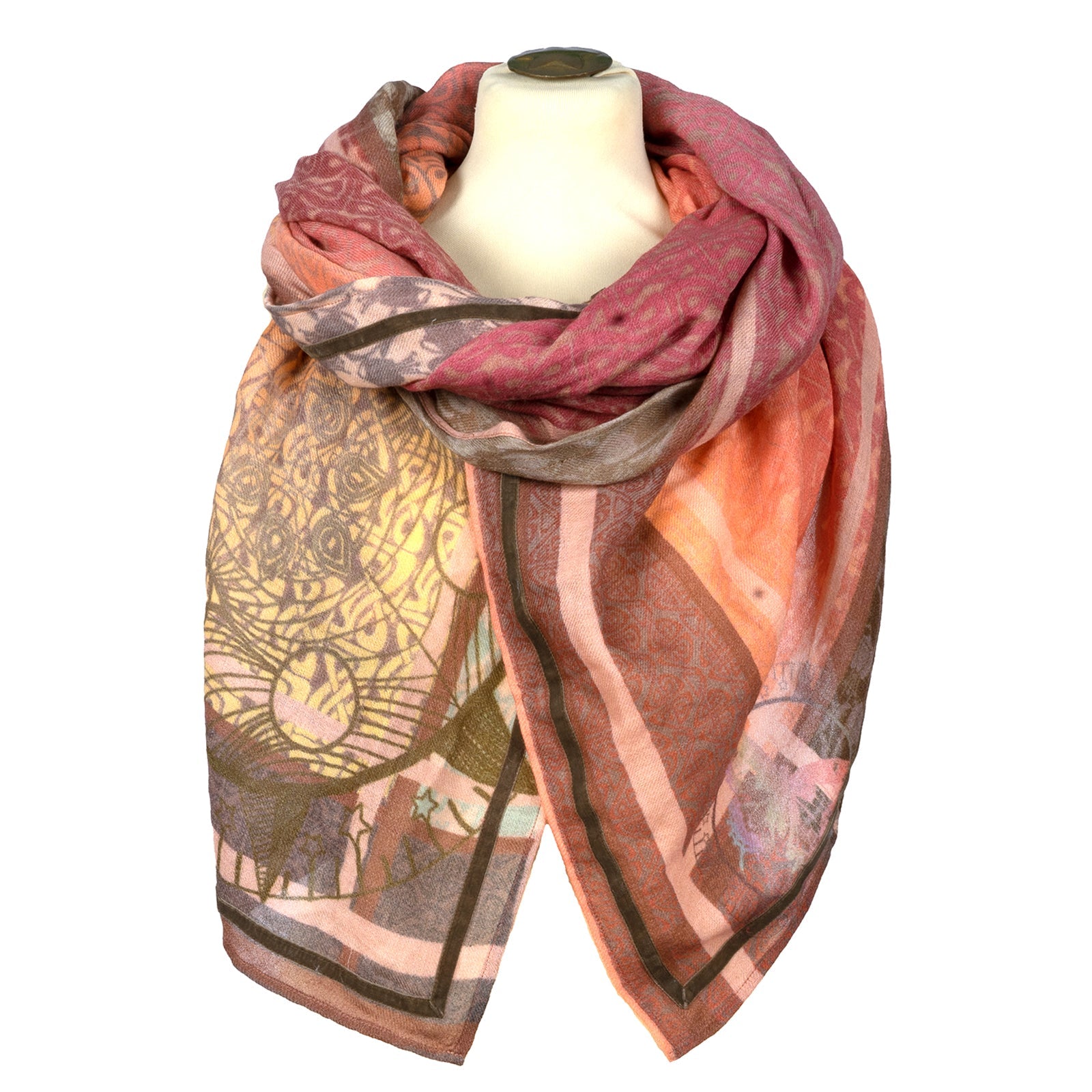 Original-Rubicon Schal mit Druck in orange und rosé Tönen, die Wolle ist leicht gewaschen, ein leichter Filzcharakter ist gewollt und gibt dem Schal einen kuscheligen weichen Handgriff.