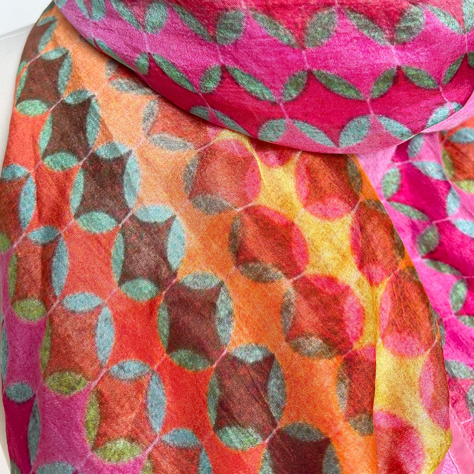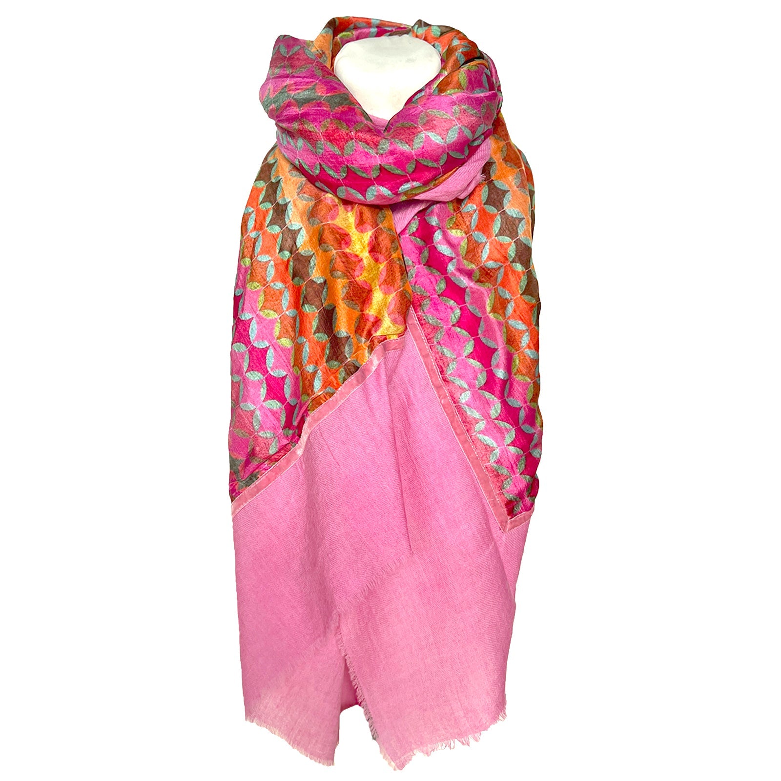 Original-Rubicon Schal mit wunderschönem Seidendruck , die Wolle ist leicht gewaschen, ein leichter Filzcharakter ist gewollt und gibt dem Schal einen kuscheligen Handgriff, die Seide schmiegt sich an den Hals, glatt und weich.