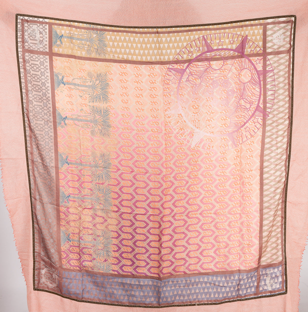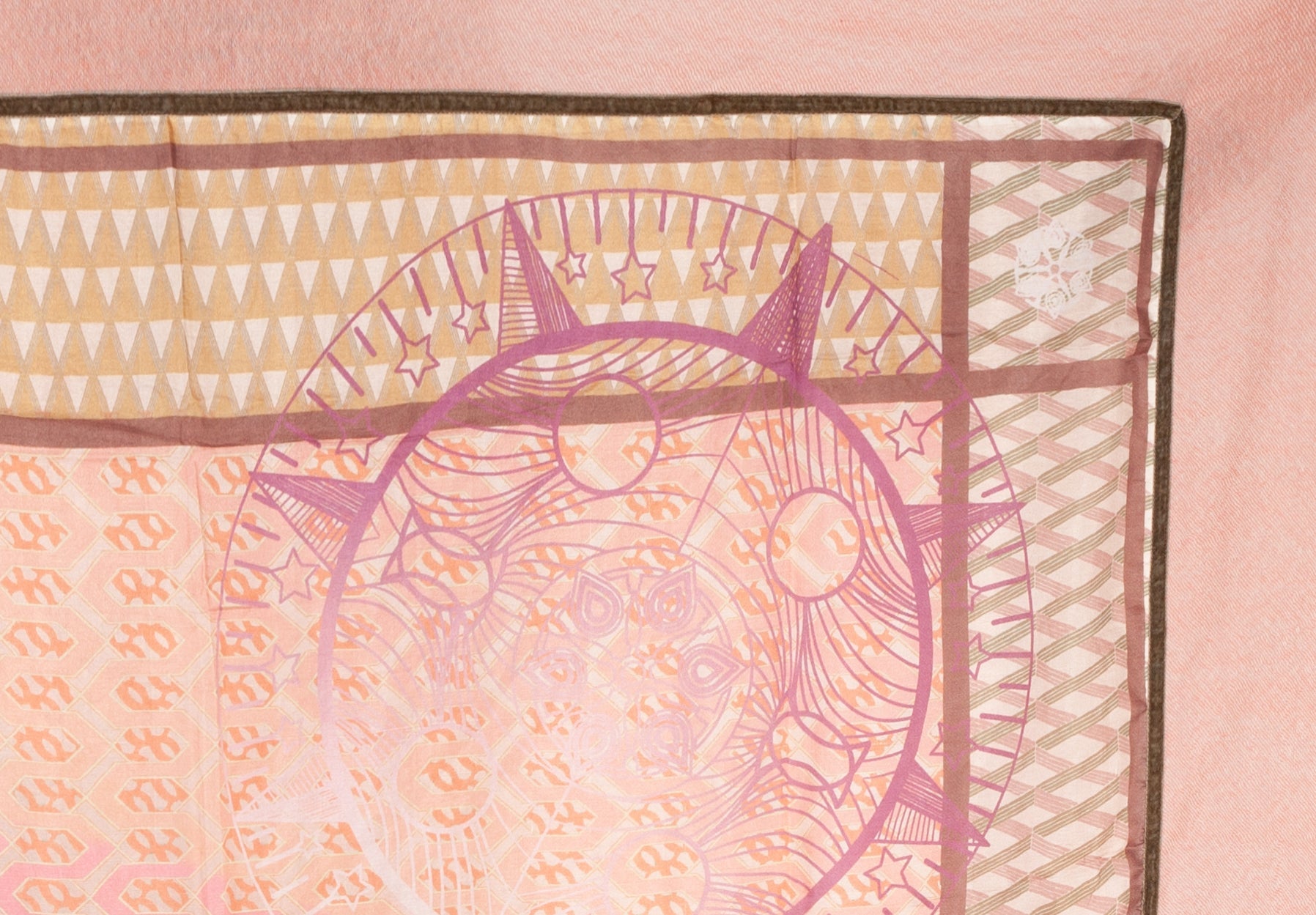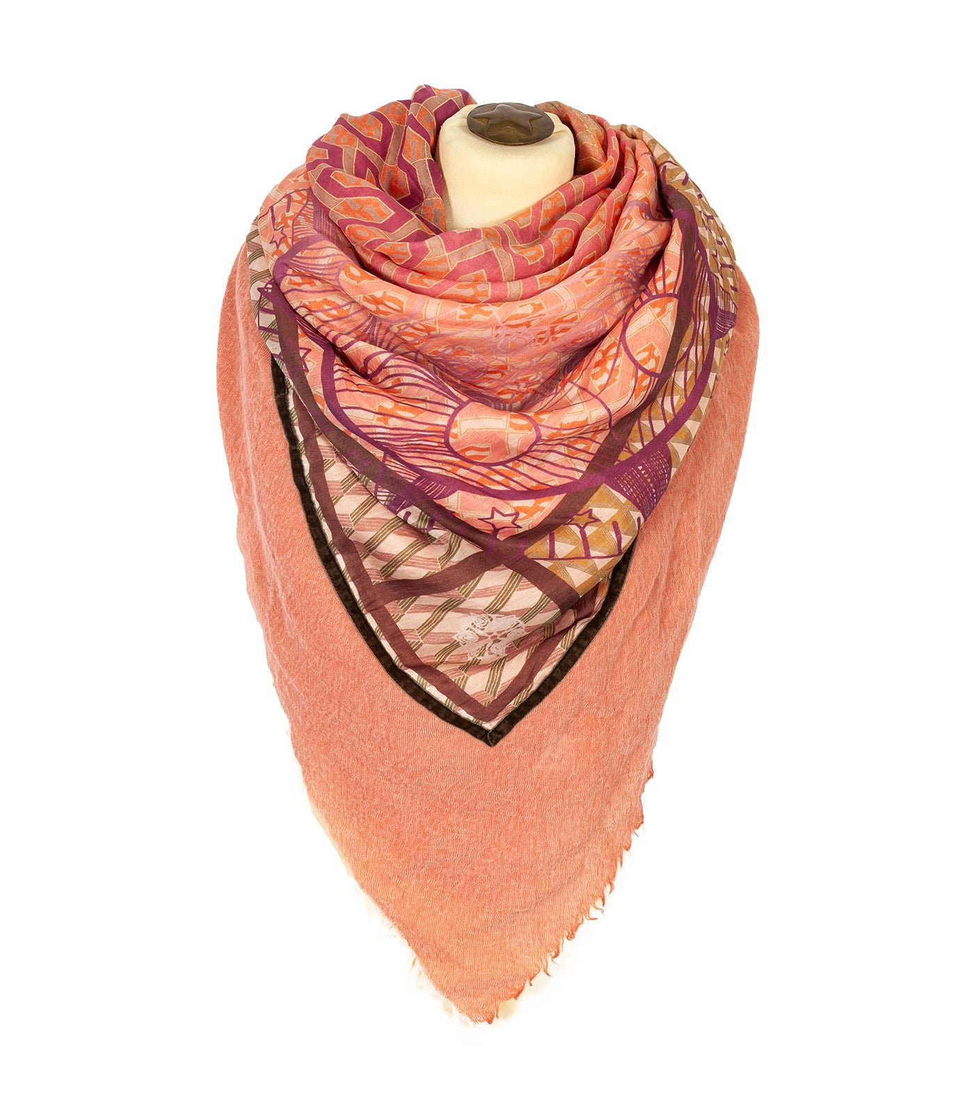 Original-Rubicon Tuch mit wunderschönen Seidendruck in pink Tönen, die Wolle ist leicht gewaschen, ein leichter Filzcharakter ist gewollt und gibt dem Schal einen kuscheligen Handgriff, die Seide schmiegt sich an den Hals, glatt und weich .
