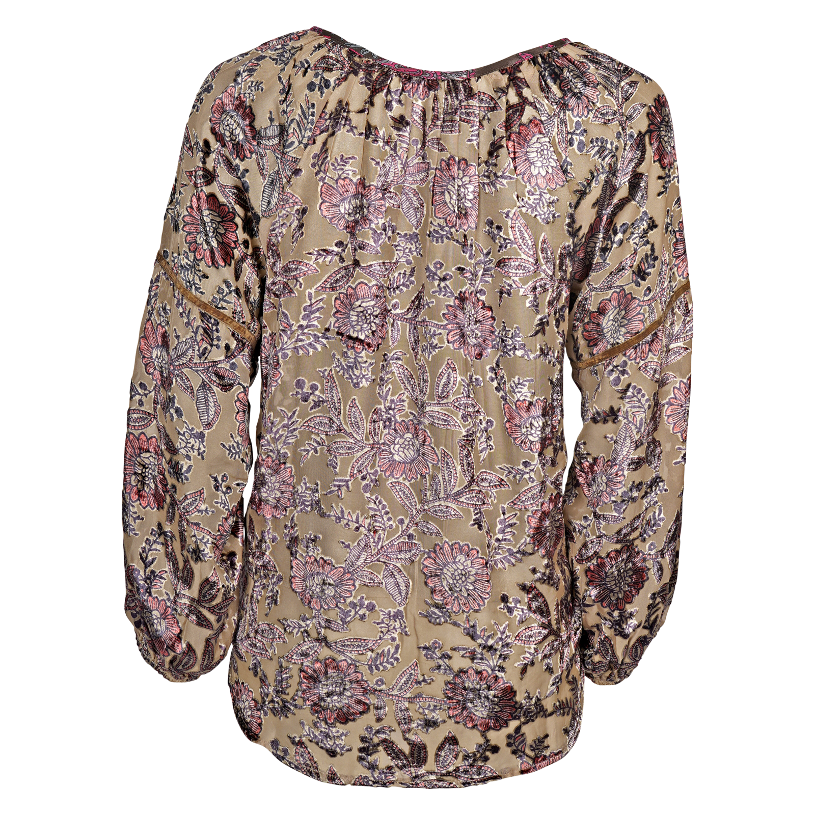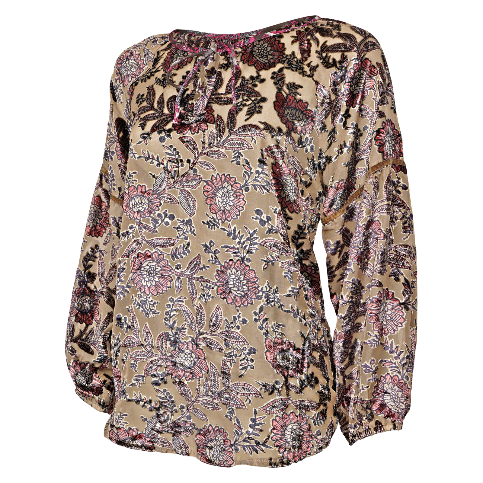 (der Samt wird um die Blumen herum"ausgebrannt", sodass nur noch die Blumen samt Druck als Samt auf dem Stoff bleiben)