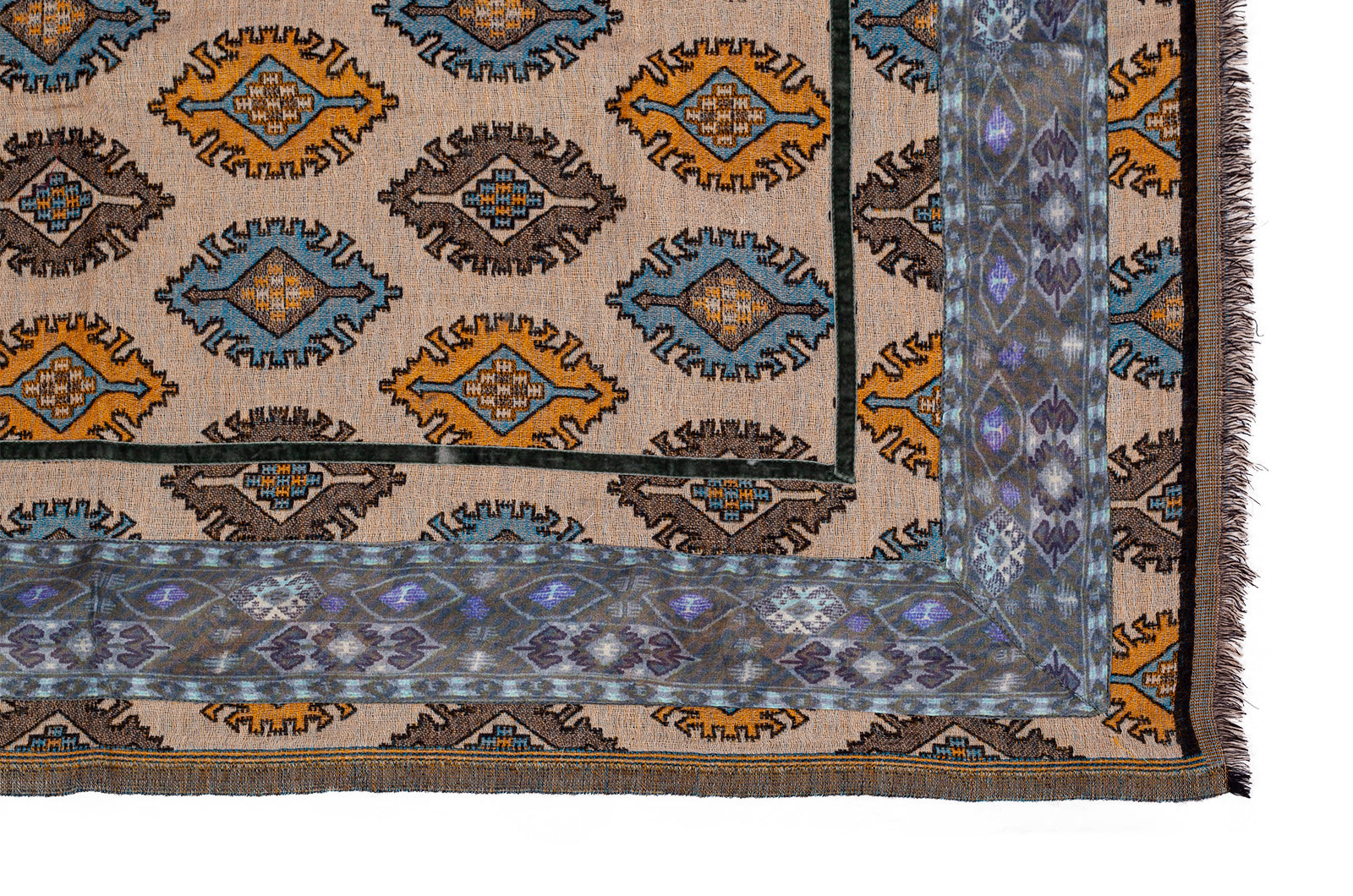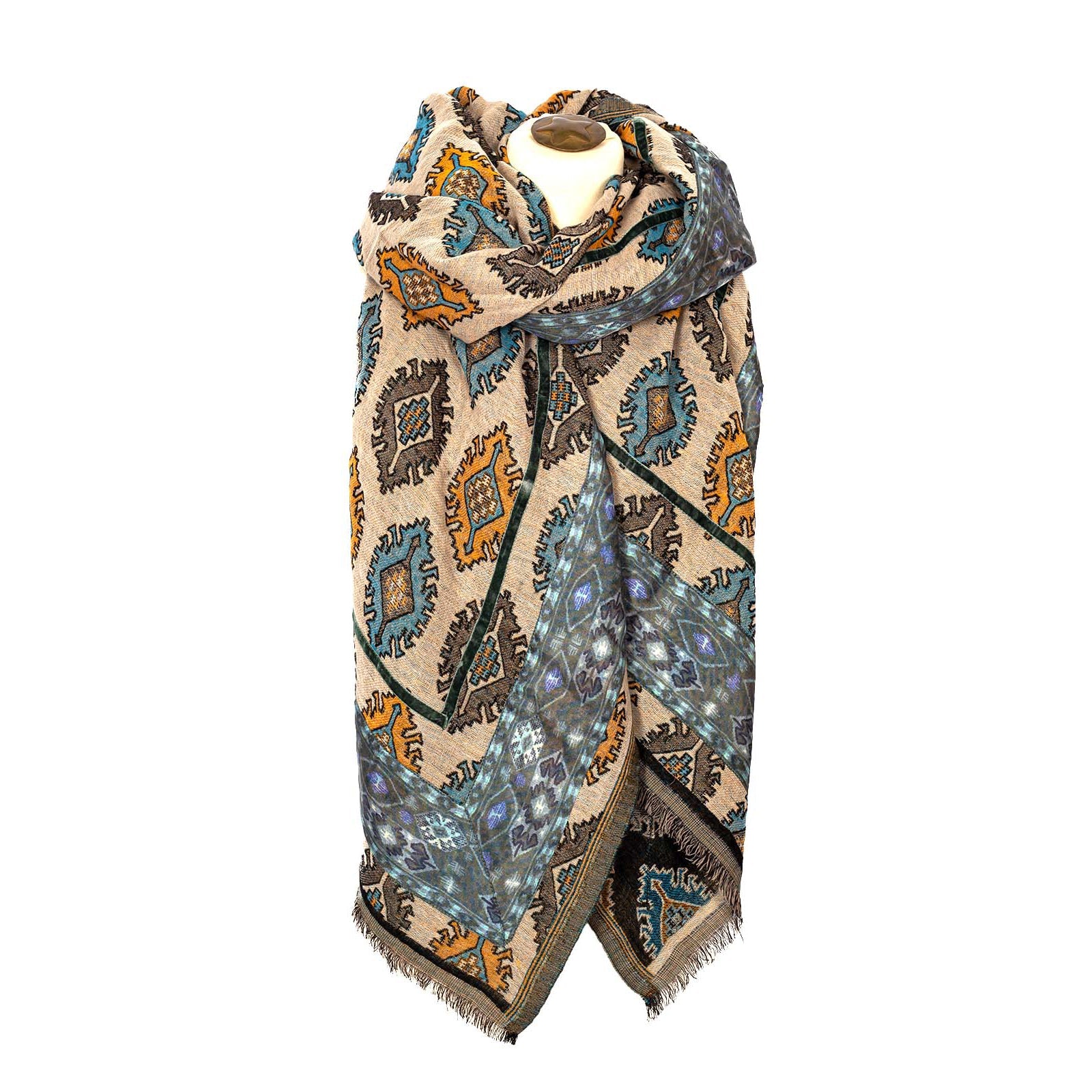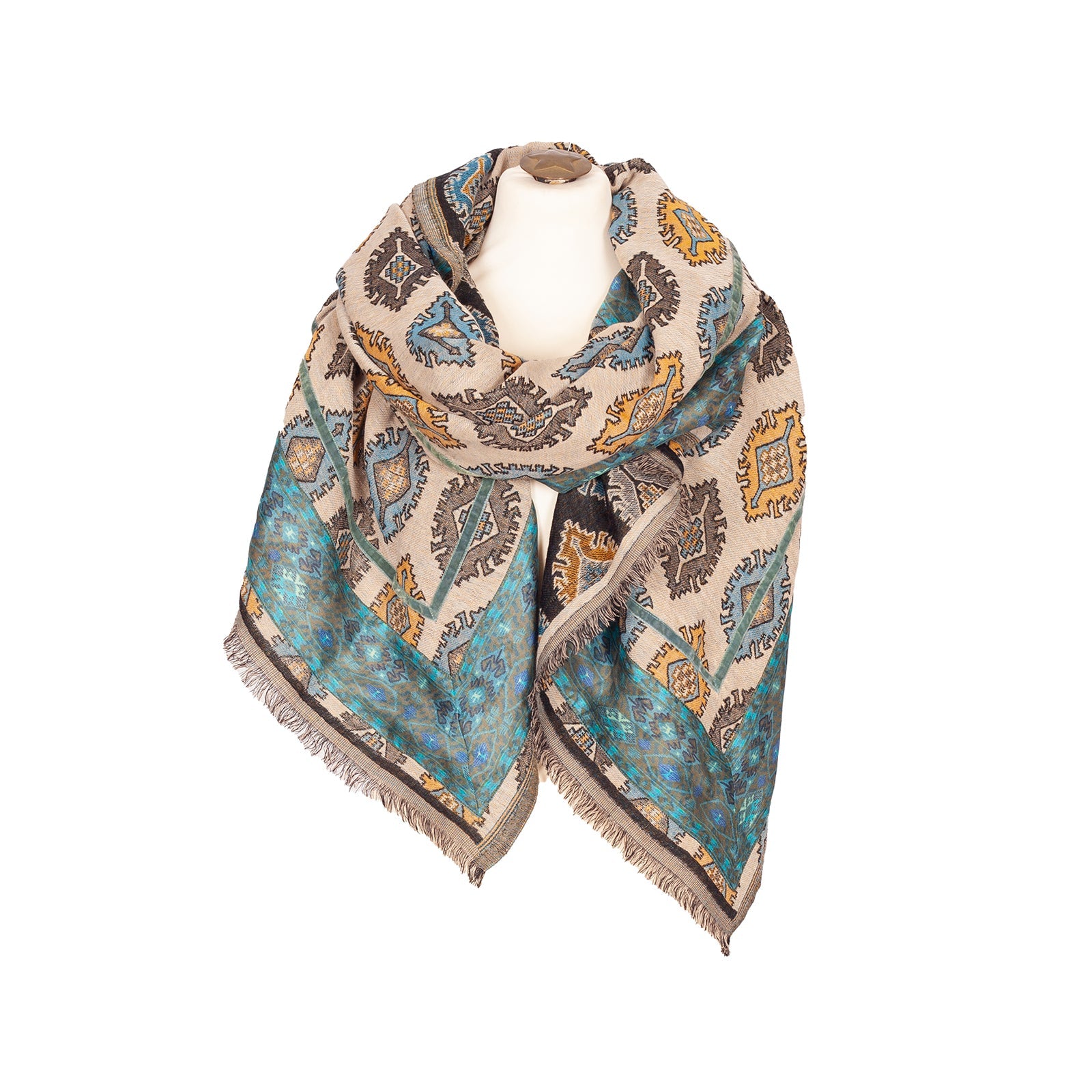 Original-Rubicon Schal mit dem wünscherschönen Seidendruck am Rand in türkis-petrol Tönen, der Schal ist in einem geometrischen Muster als Jaquard gewebt.
