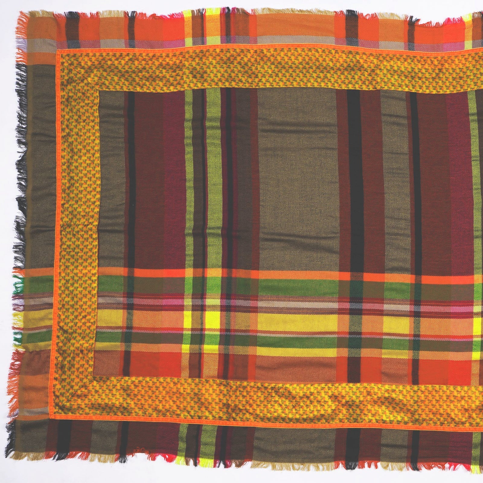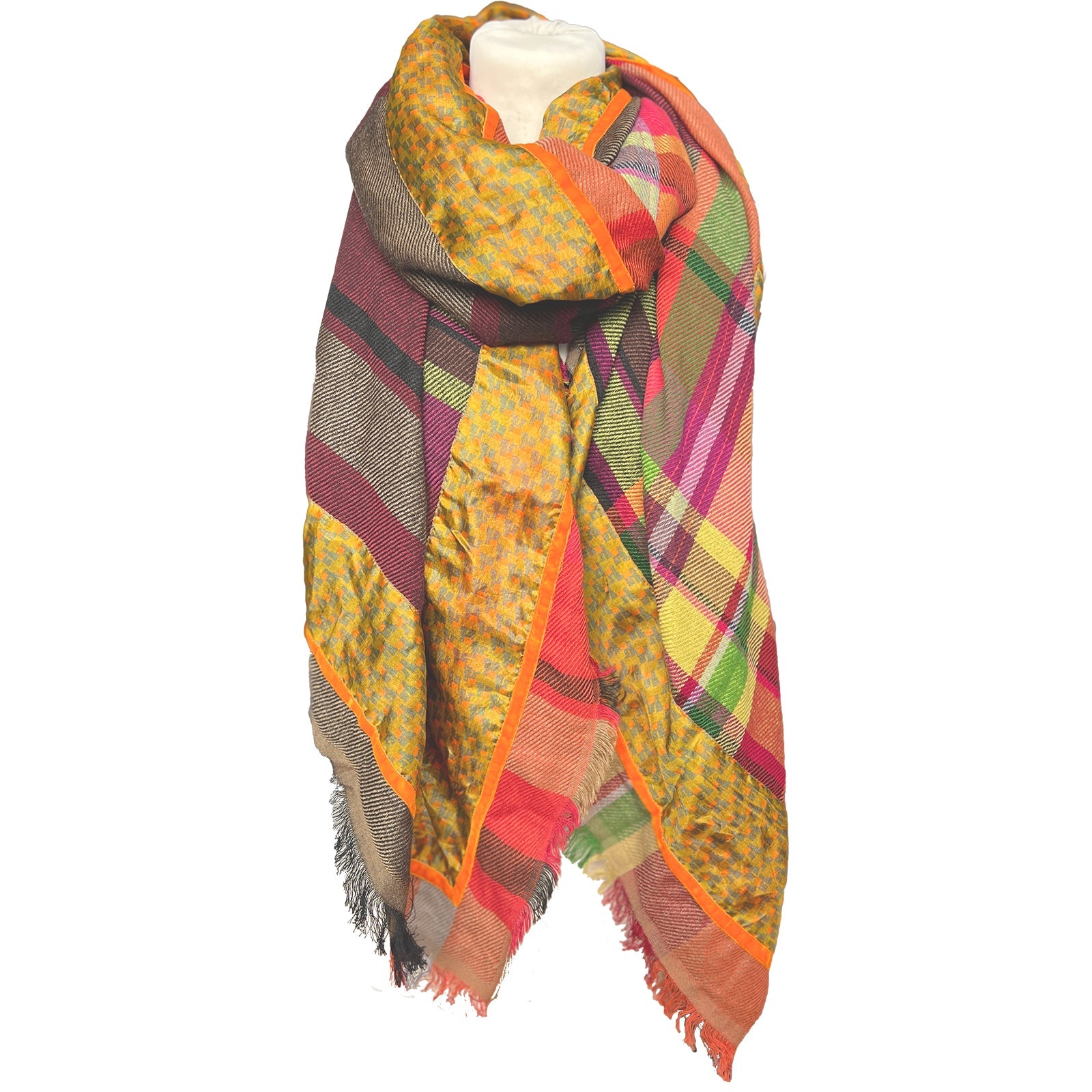 Original-Rubicon Tuch mit wünscherschönem Seidendruck in gelb und orange Tönen, das Material ist eine Baumwolle Wolle Mischung mit weichem Griff und hohem Tragekomfort, dies ausdrucksstarken Farben werden durch die Seidenborder akzentuiert.
