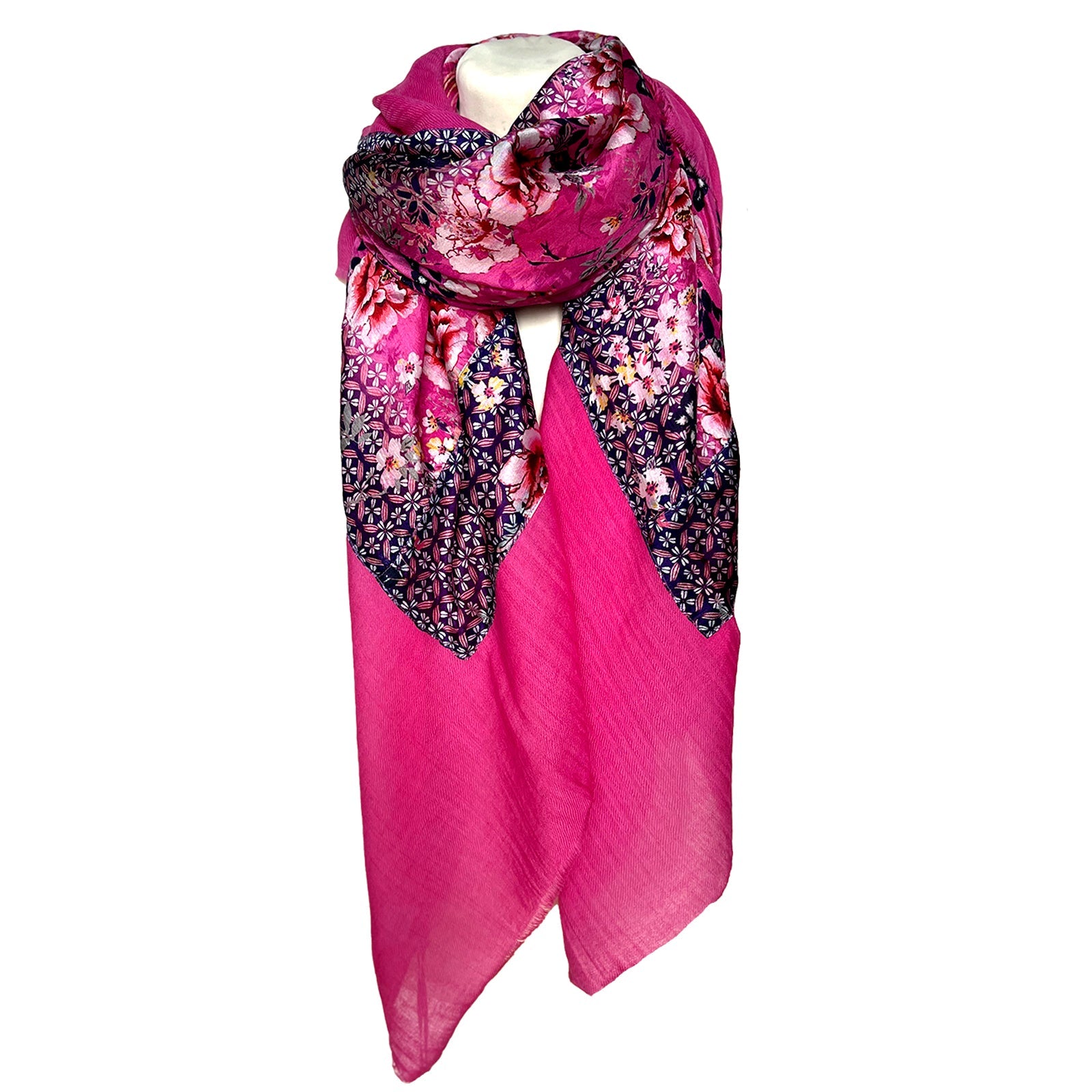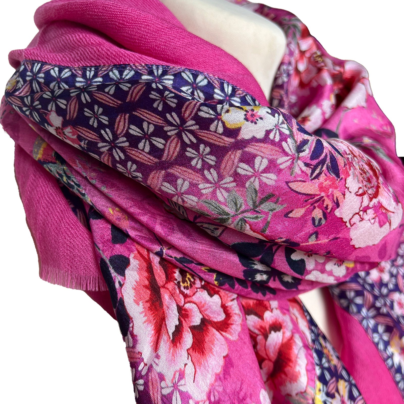 Original-Rubicon Tuch mit wunderschönem, blumigen Seidendruck , die Wolle ist leicht gewaschen, ein leichter Filzcharakter ist gewollt und gibt dem Schal einen kuscheligen Handgriff, die Seide schmiegt sich an den Hals, glatt und weich.