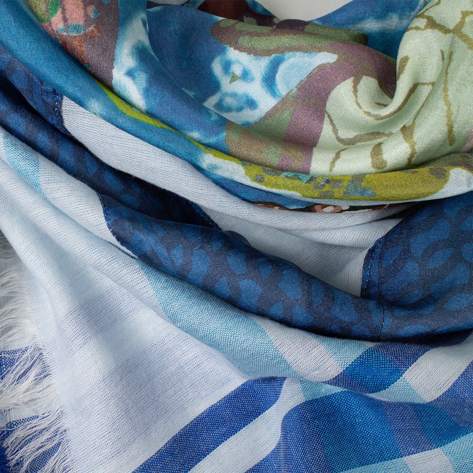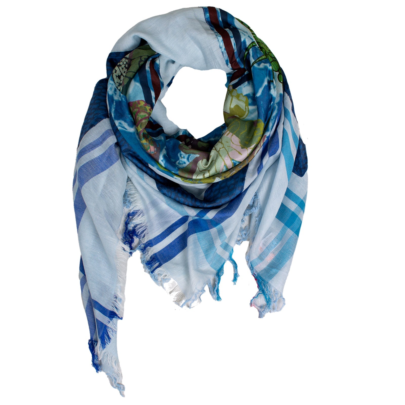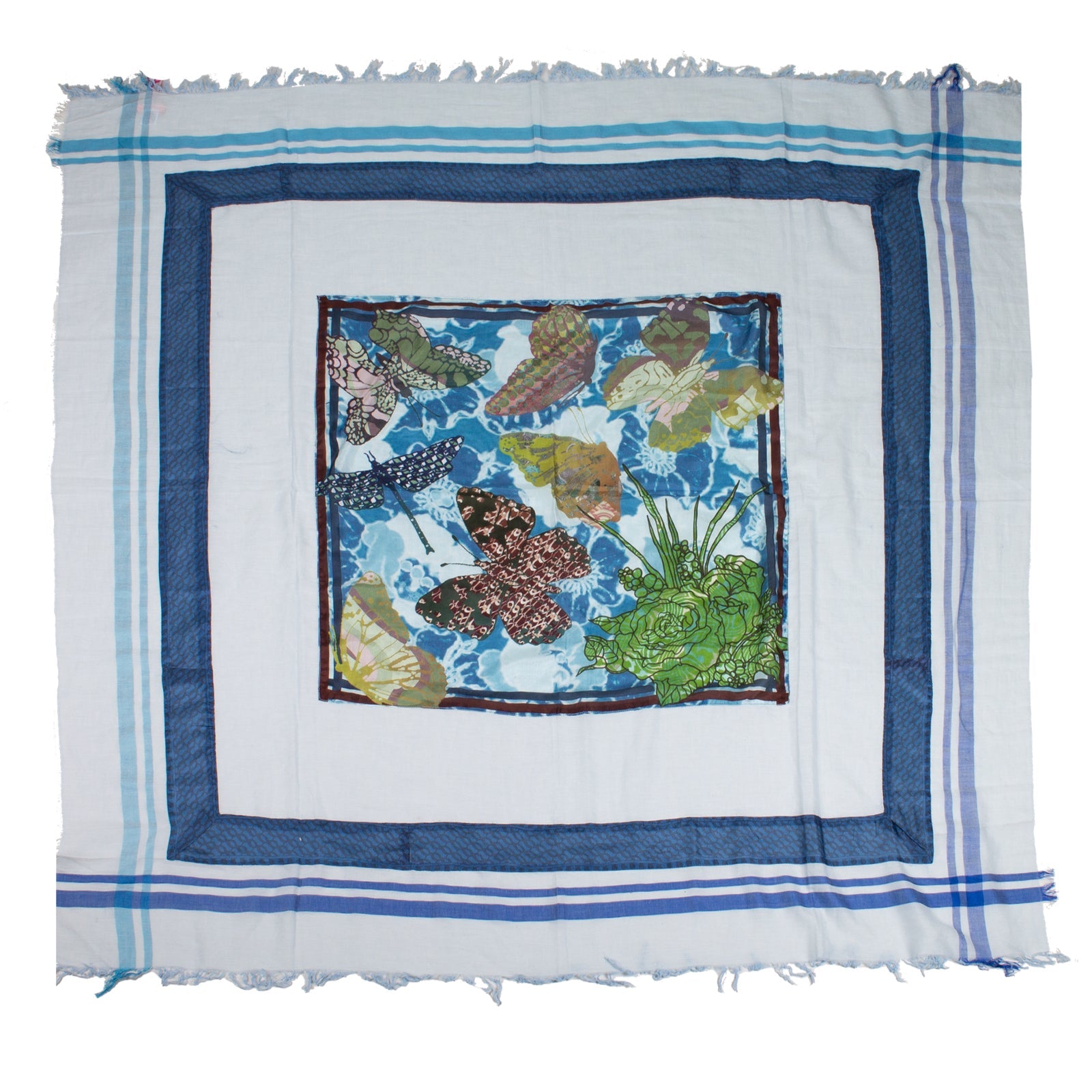 Original RUBICON Damentuch aus Naturmaterialien.Sommertuch aus luftiger Baumwolle mit eingewebtem Seidenrand und passenden mehrfarbigen Seidendruck mit Schmetterlingen und Blumen.