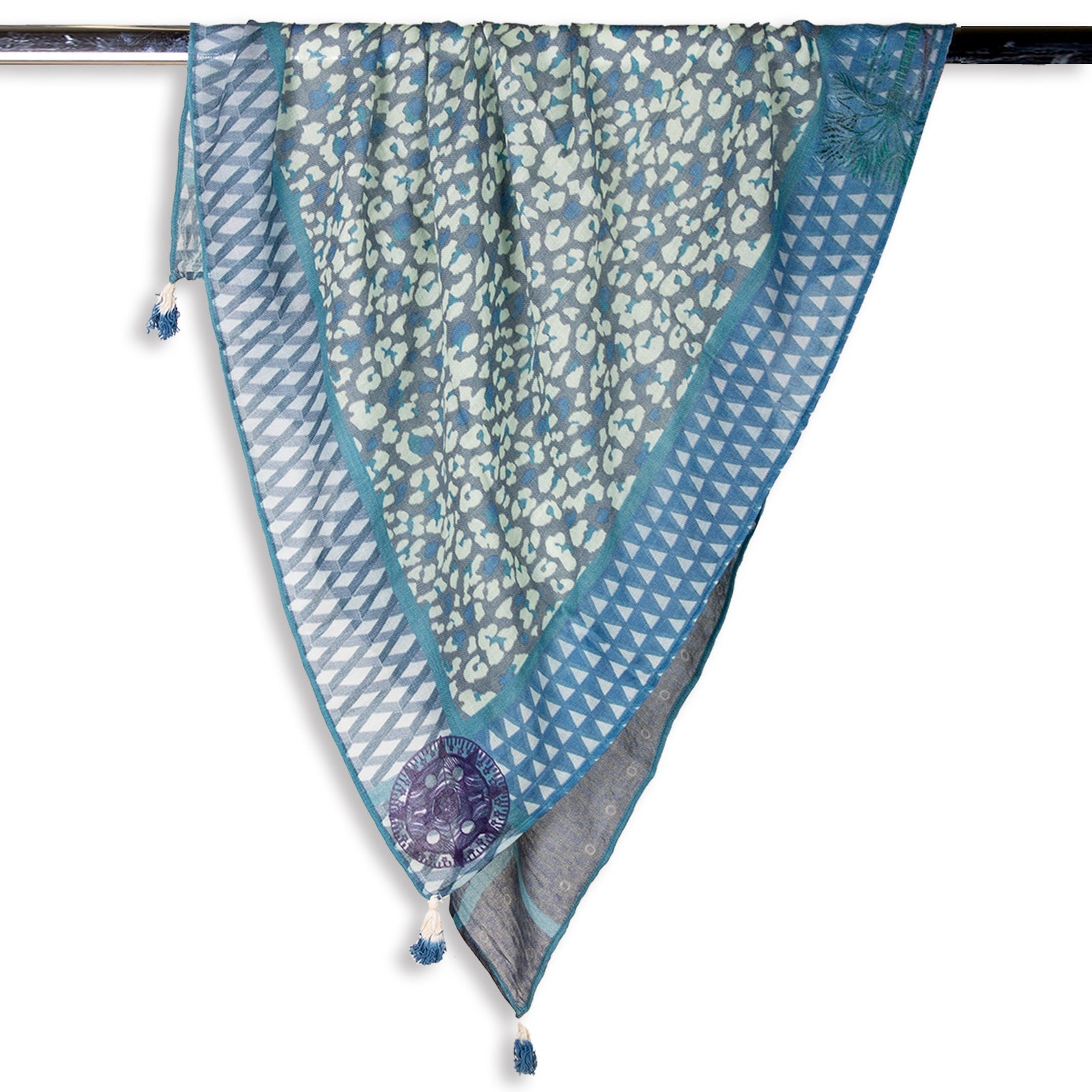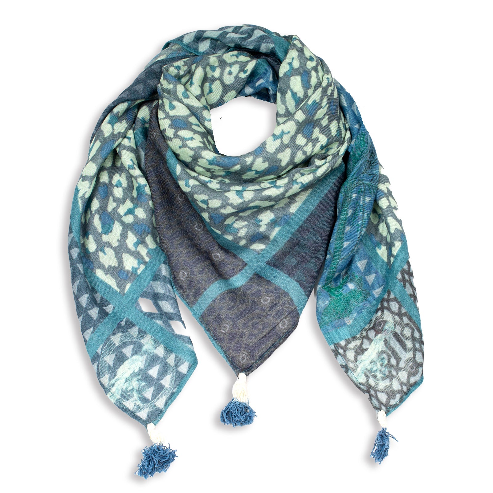 Dieses KIKU Tuch 5135 verbindet Leoprint mit einem charmanten Patchwork- und Borderprint. Vielseitig tragbar als Halstuch, Schal oder stylisches Dreieckstuch, verleiht es jedem Outfit einen modischen Akzent !