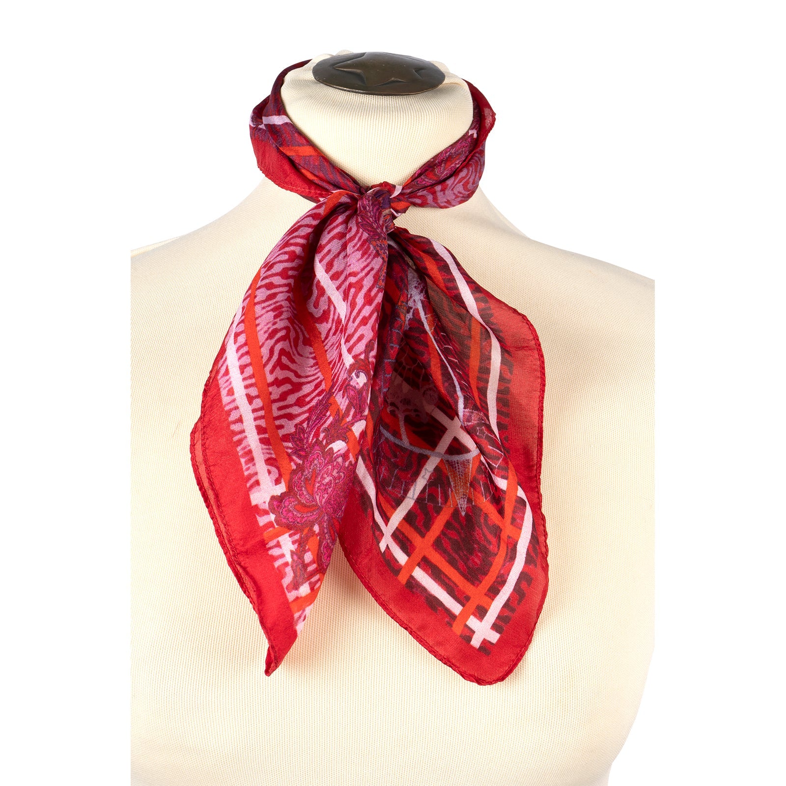 Original-Rubicon Tuch mit Druck aus leichter fliessender Seide in berry und rot Tönen, die Seide schmiegt sich an den Hals, glatt und weich.