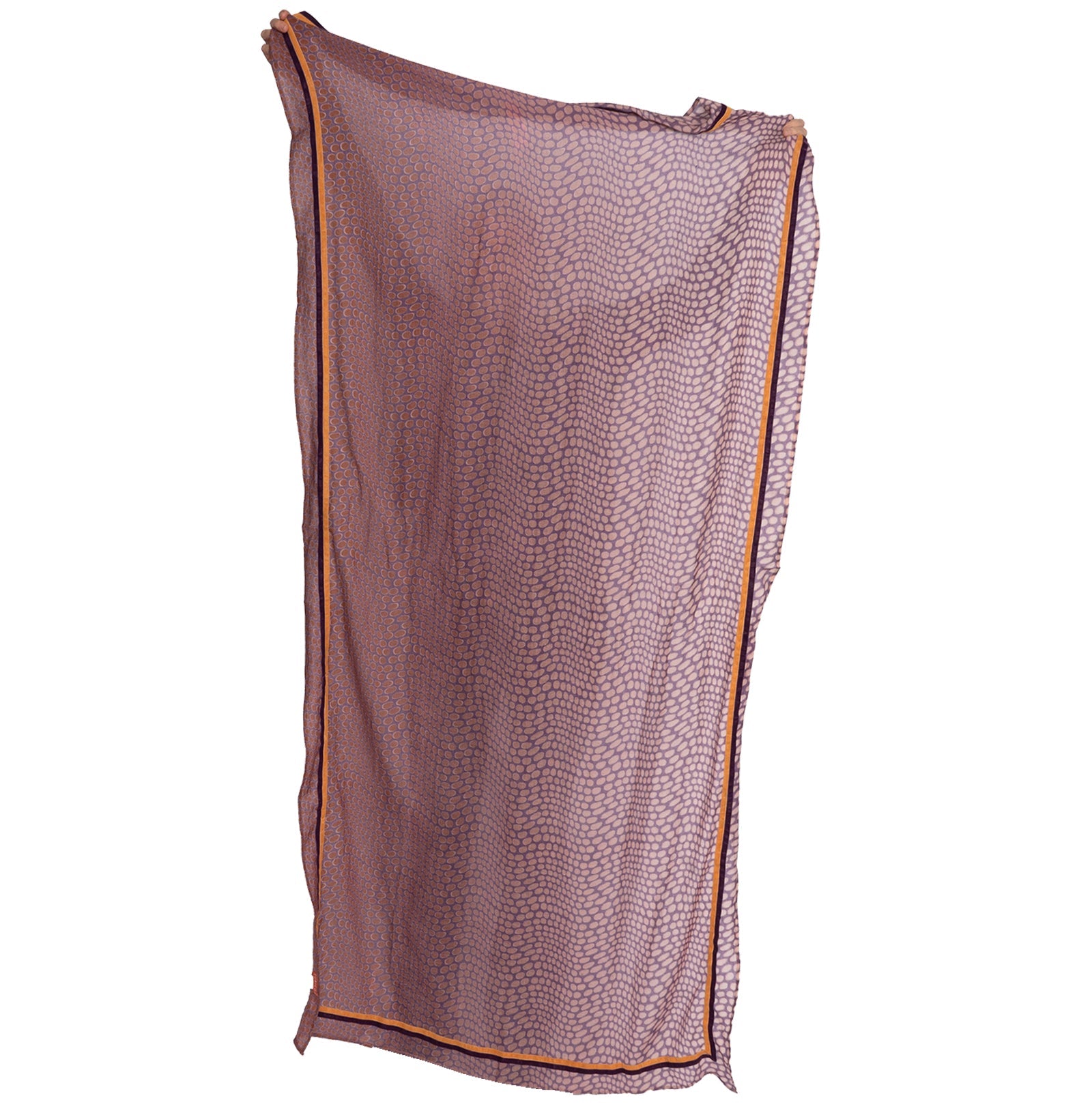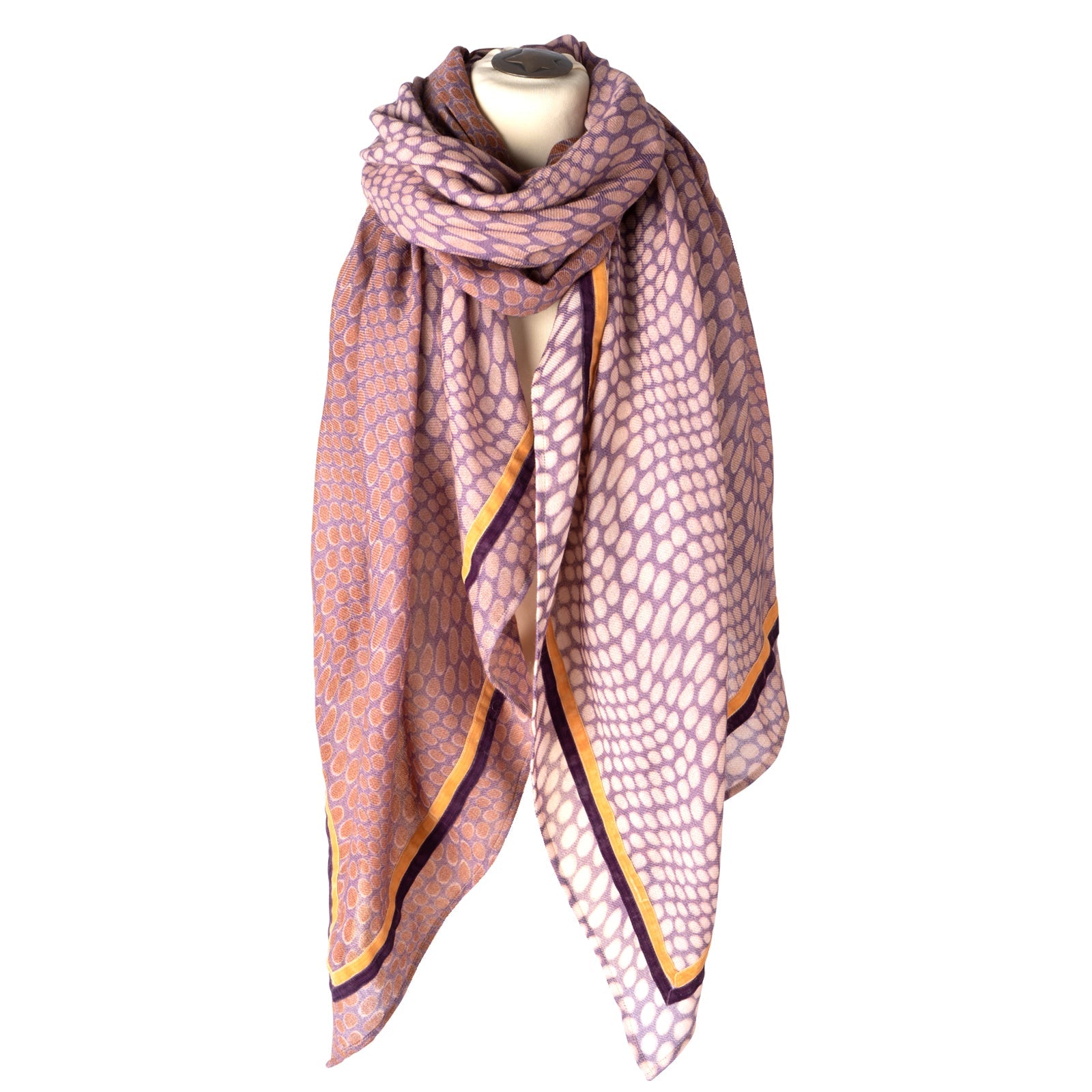 Original-Rubicon Tuch mit Druck in violett und mauve Tönen, die Wolle ist leicht gewaschen, ein leichter Filzcharakter ist gewollt und gibt dem Schal einen kuscheligen weichen Handgriff.