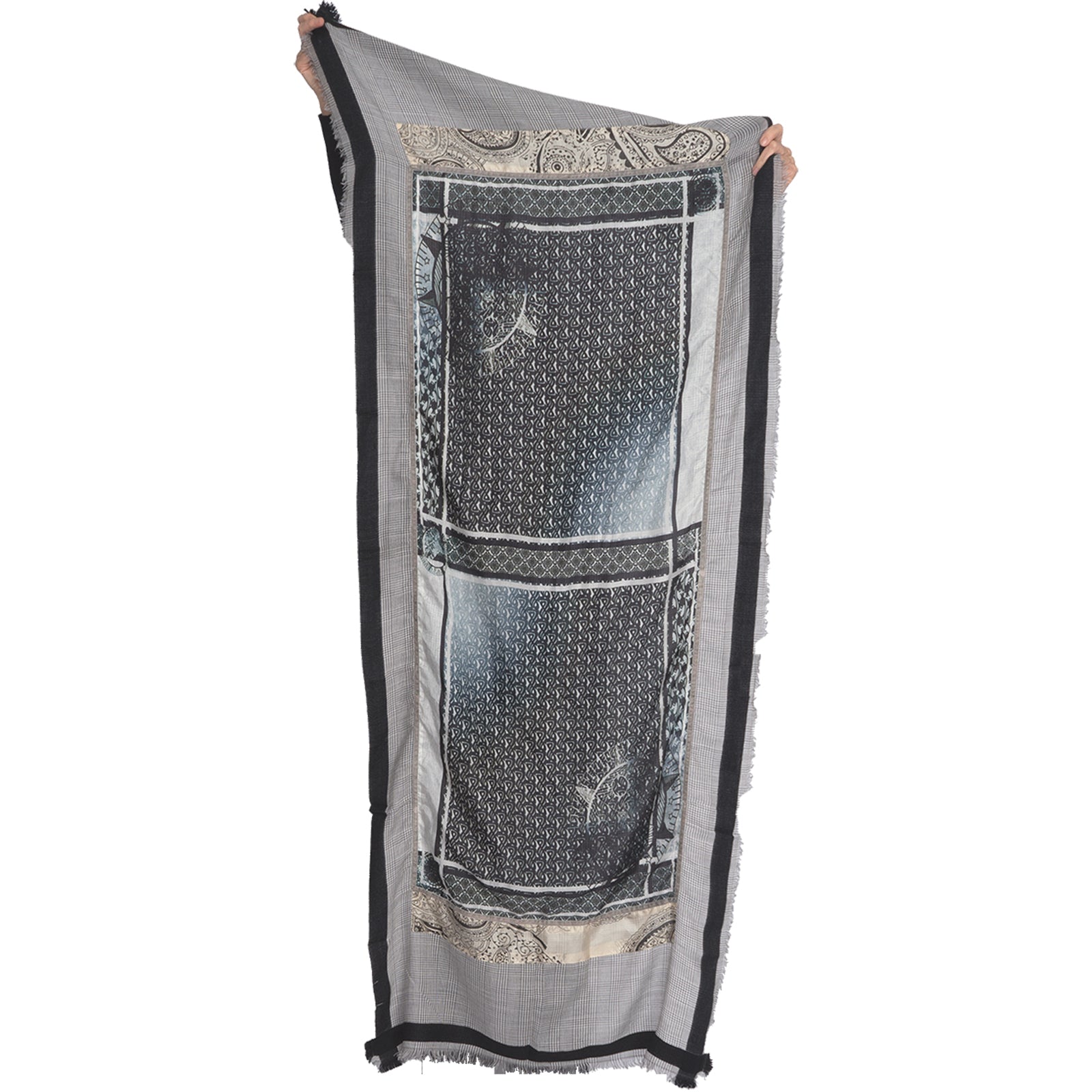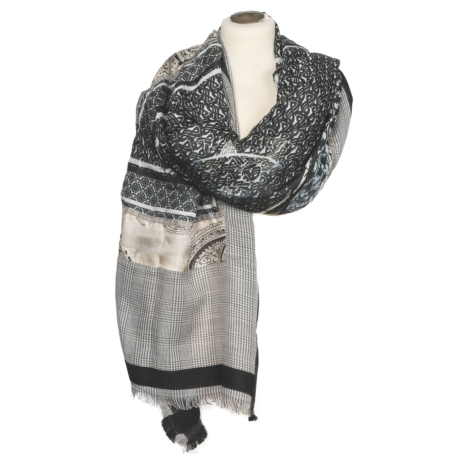 Original-Rubicon Tuch mit wunderschönem Seidendruck in schwarz weiß Tönen, das Material ist eine Wolle Baumwolle Mischung mit weichem Griff und hohem Tragekomfort, die Seide schmiegt sich an den Hals, glatt und weich .